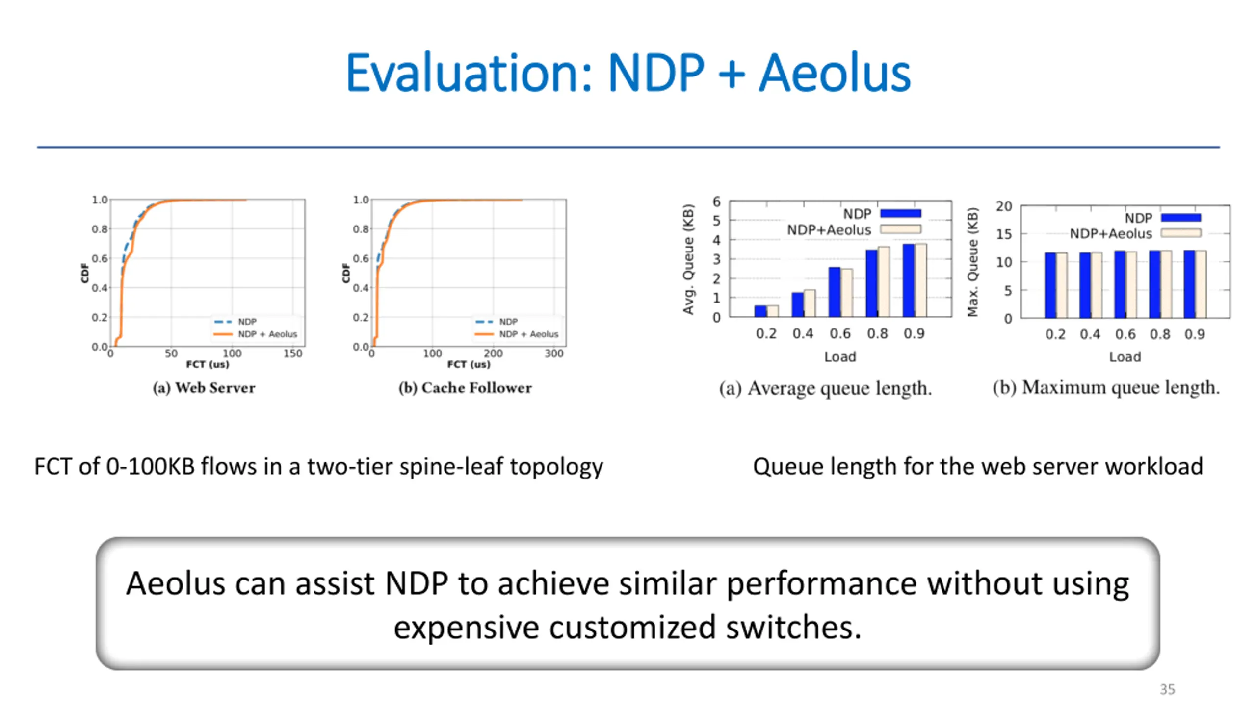 Evaluation: Evaluation: Homa Homa + Aeolus + Aeolus tail>100ms tail>100ms tail>30ms tail<180us tail<800us tail<400us Aeolus can assist Homa to eliminate large queues & loss of scheduled packets, thus significantly improve the tail FCTs. 34 34