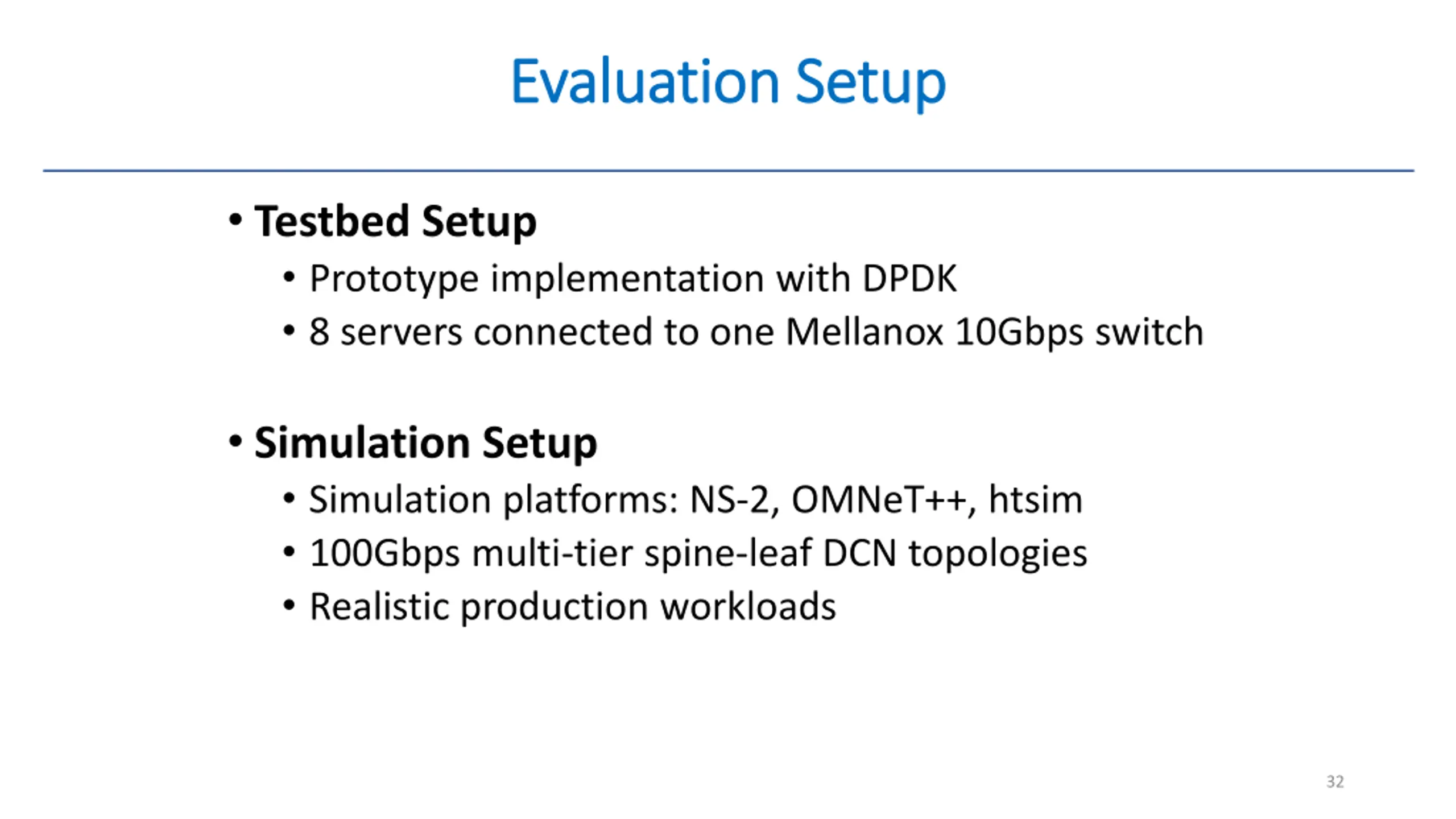 Evaluation Setup Evaluation Setup Testbed Setup Prototype implementation with DPDK 8 servers connected to one Mellanox 10Gbps switch Simulation Setup Simulation platforms: NS-2, OMNeT++, htsim 100Gbps multi-tier spine-leaf DCN topologies Realistic production workloads 32