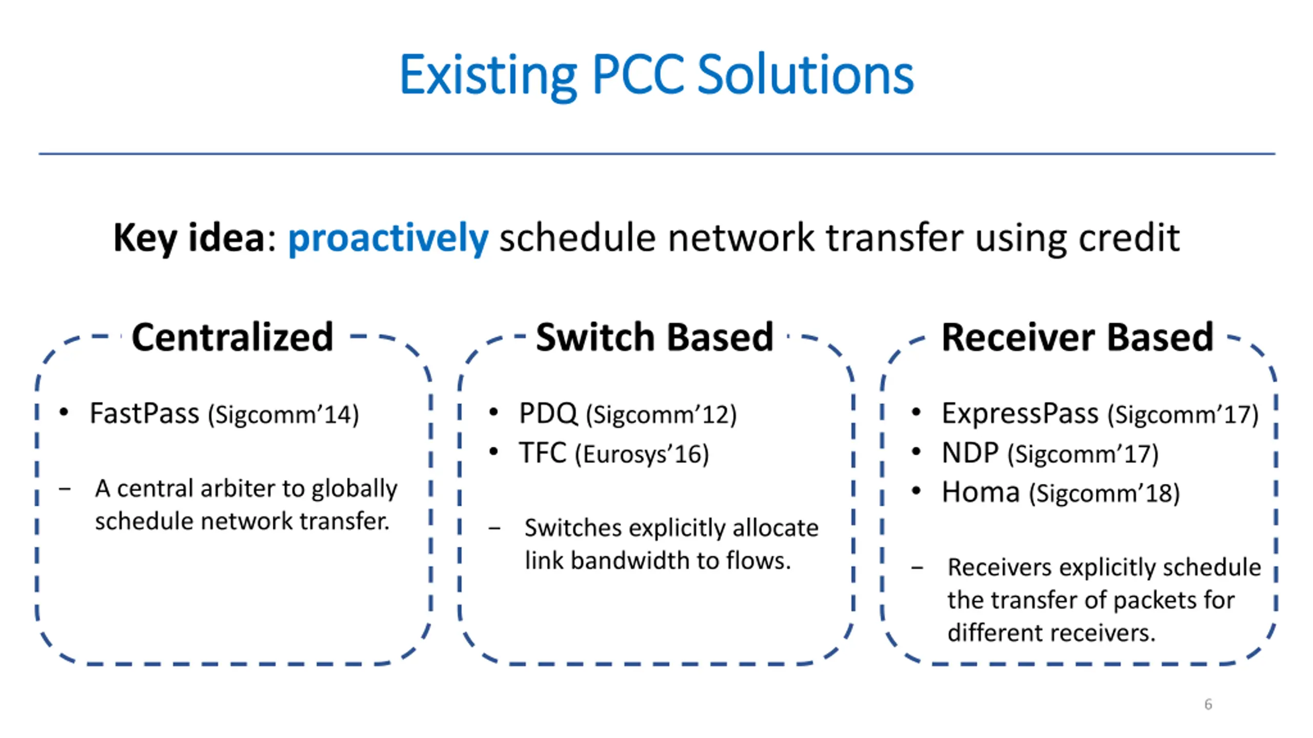 Existing PCC Solutions Existing PCC Solutions Key idea: proactively schedule network transfer using credit Centralized Switch Based Receiver Based FastPass (Sigcomm 14) PDQ (Sigcomm 12) TFC (Eurosys 16) ExpressPass (Sigcomm 17) NDP (Sigcomm 17) Homa (Sigcomm 18) A central arbiter to globally schedule network transfer. Switches explicitly allocate link bandwidth to flows. Receivers explicitly schedule the transfer of packets for different receivers. 6