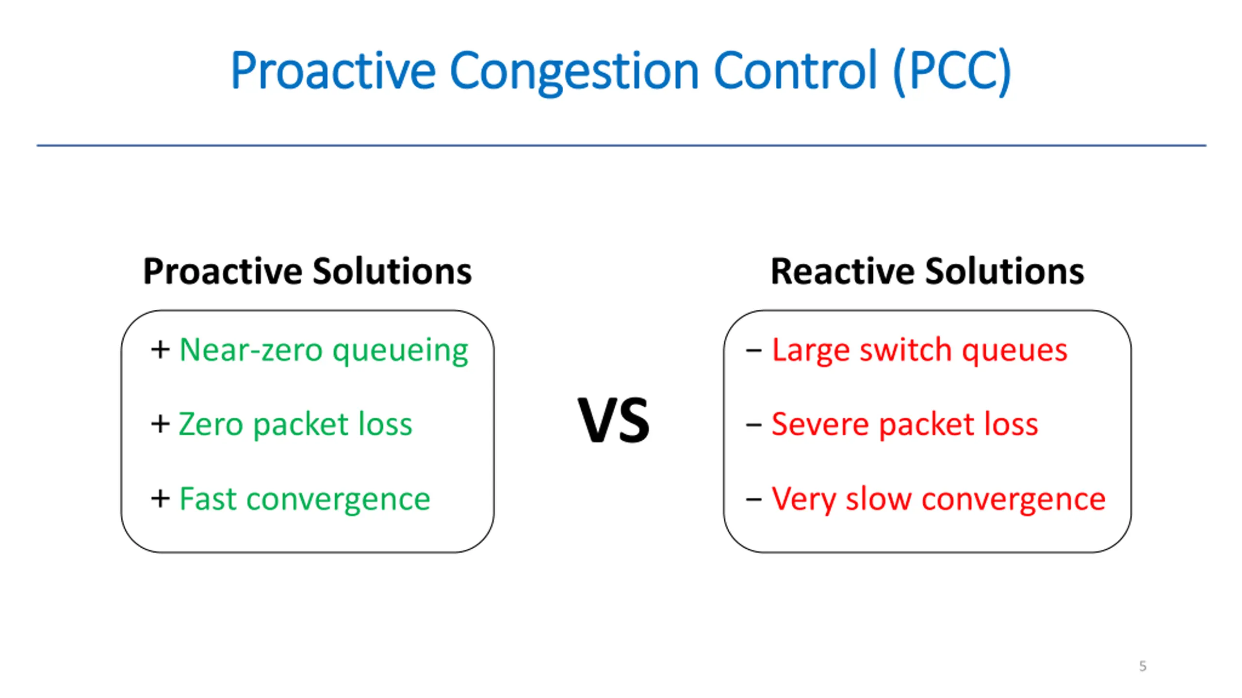 Congestion Control Today Congestion Control Today Current solution: mainly using reactive protocols TCP, DCTCP, TIMELY, react to signals after congestion occurs Large switch queues Severe loss under incast Very slow convergence Worse with higher link speed 4