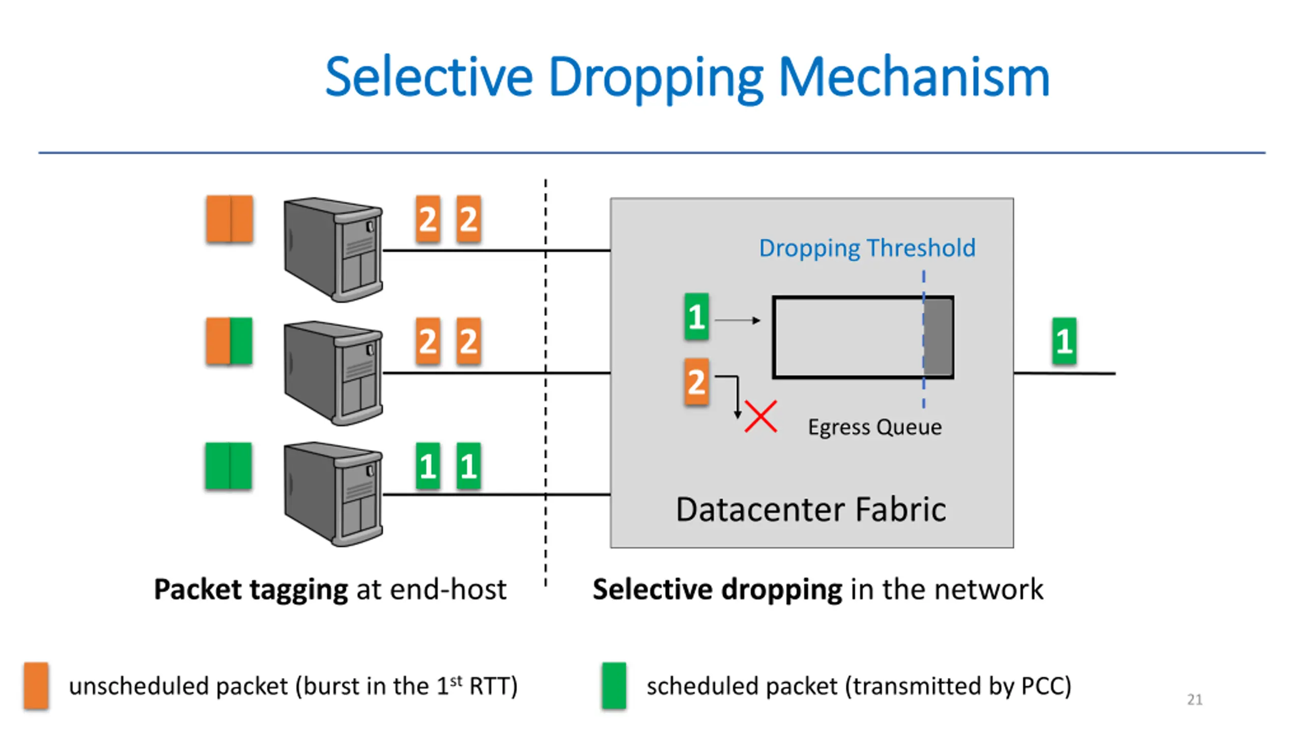 Selective Dropping Mechanism Selective Dropping Mechanism 2 2 Dropping Threshold 1 2 2 1 2 Egress Queue 1 1 Datacenter Fabric Packet tagging at end-host Selective dropping in the network unscheduled packet (burst in the 1st RTT) scheduled packet (transmitted by PCC) 21