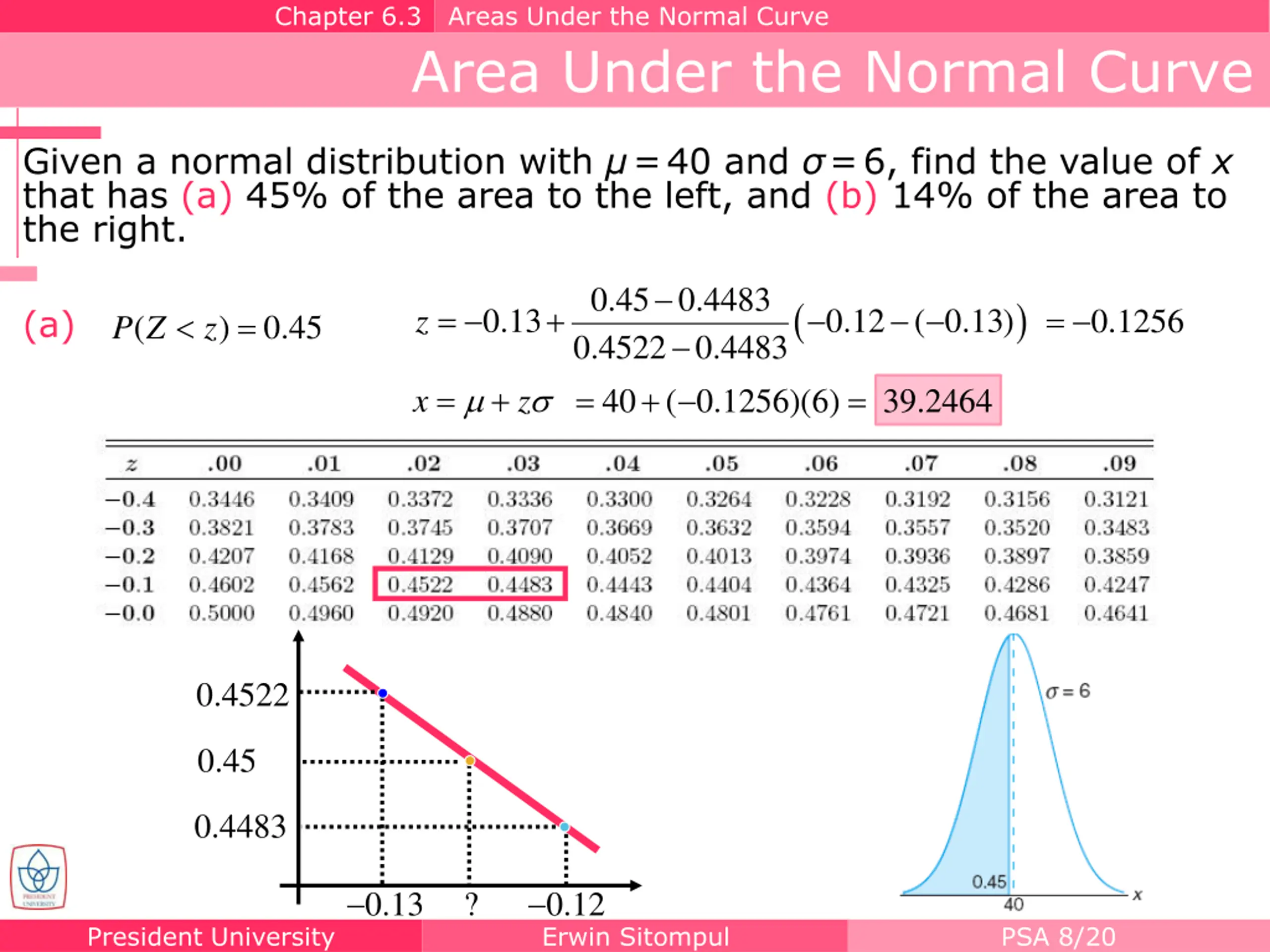 Chapter 6.3 Areas Under the Normal Curve Area Under the Normal Curve Given a normal distribution with =40 and =6, find the value of x that has (a) 45% of the area to the left, and (b) 14% of the area to the right. 0.45 0.4483 0.4522 0.4483 40 ( 0.1256)(6) = + ( ) = + 0.12 ( 0.13) 0.1256 = 0.13 z (a) = ( ) 0.45 P Z z = + = 39.2464 x z 0.4522 0.45 0.4483 0.13 0.12 ? President University Erwin Sitompul PSA 8/20