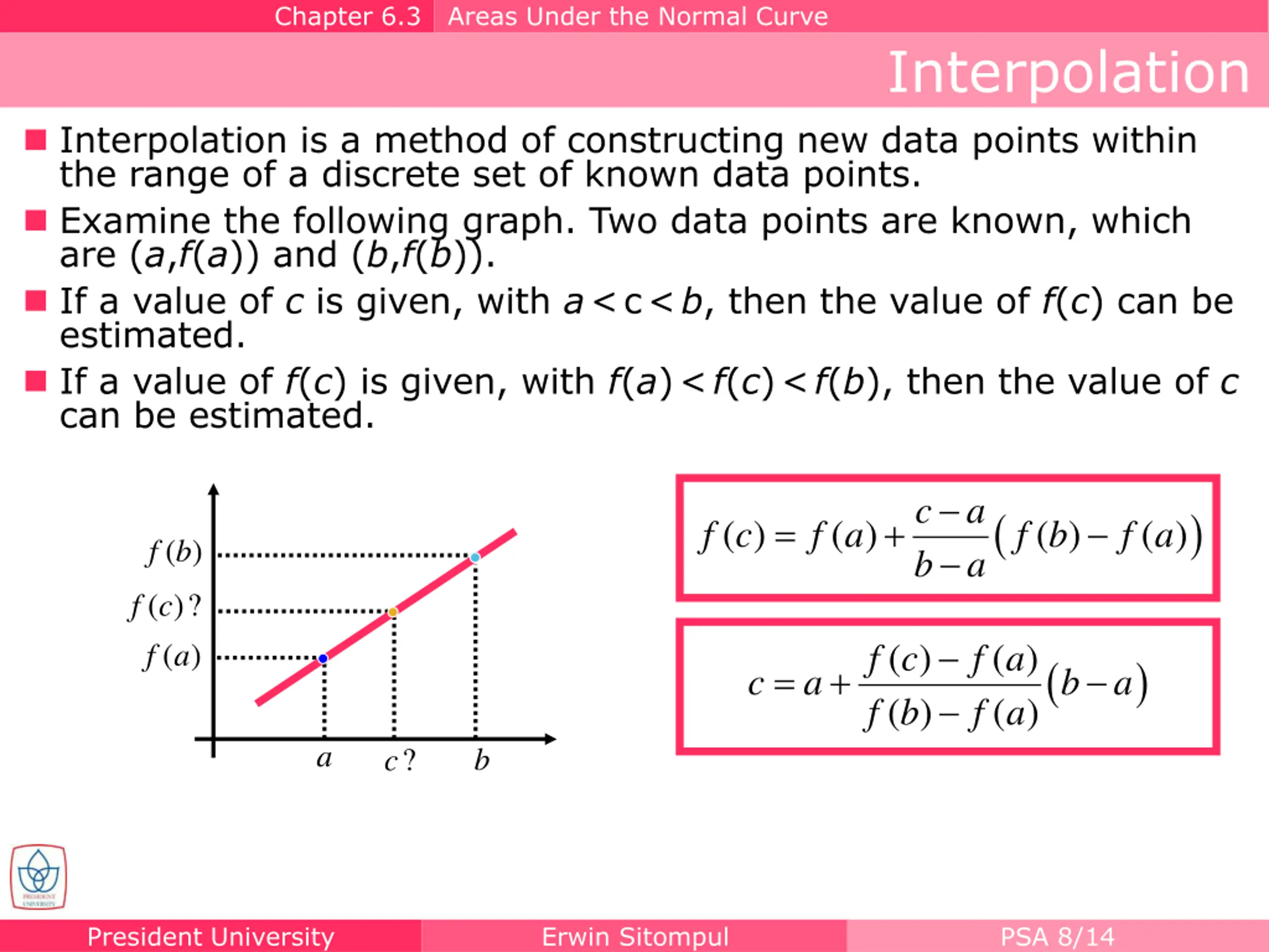 Chapter 6.3 Areas Under the Normal Curve Interpolation Interpolation is a method of constructing new data points within the range of a discrete set of known data points. Examine the following graph. Two data points are known, which are (a,f(a)) and (b,f(b)). If a value of c is given, with a<c<b, then the value of f(c) can be estimated. If a value of f(c) is given, with f(a)<f(c)<f(b), then the value of c can be estimated. c a b a ( ) = + ( ) f c ( ) f a ( ) f b ( ) f a ( ) f b ( )? f c ( ) ( ) f b ( ) ( ) f a f c f a ( ) f a ( ) = + b a c a a b ? c President University Erwin Sitompul PSA 8/14