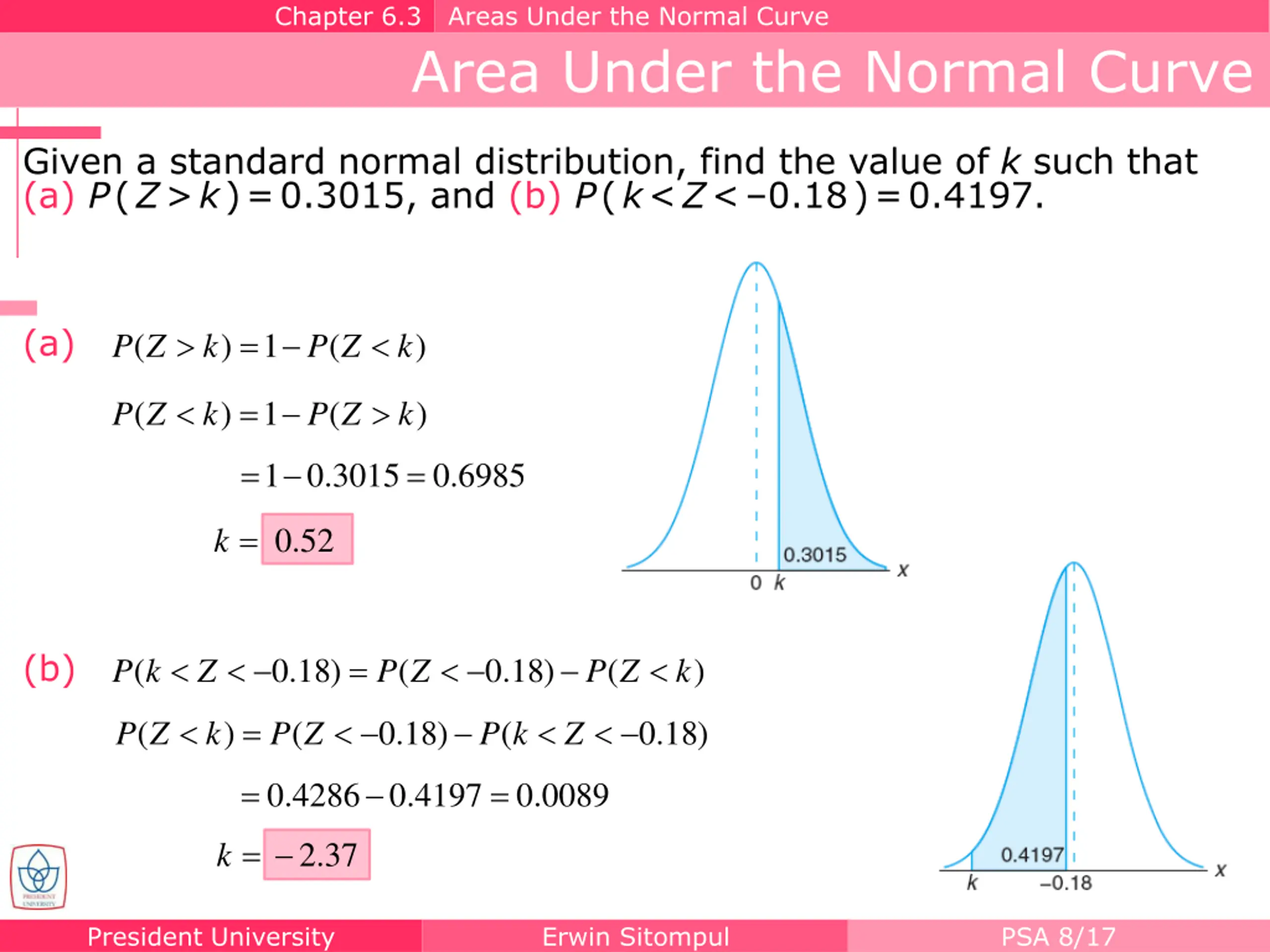 Chapter 6.3 Areas Under the Normal Curve Area Under the Normal Curve Given a standard normal distribution, find the value of k such that (a) P(Z>k)=0.3015, and (b) P(k<Z< 0.18)=0.4197. (a) ) 1 = ( ( ) P Z k P Z k ) 1 = ( ( ) P Z k P Z k 1 0.3015 = = 0.6985 k = 0.52 (b) = ( 0.18) ( 0.18) ( ) P k Z P Z P Z k = ( ) ( 0.18) ( 0.18) P Z k P Z P k Z = 0.4286 0.4197 = 0.0089 k = 2.37 President University Erwin Sitompul PSA 8/17