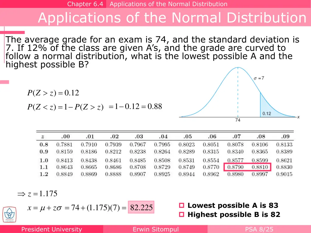 Chapter 6.4 Applications of the Normal Distribution Applications of the Normal Distribution The average grade for an exam is 74, and the standard deviation is 7. If 12% of the class are given A s, and the grade are curved to follow a normal distribution, what is the lowest possible A and the highest possible B? = ( ) 0.12 = P Z z 1 0.12 = = 0.88 ( ) 1 ( ) P Z z P Z z = = 1.175 + z Lowest possible A is 83 Highest possible B is 82 = 74 (1.175)(7) + = 82.225 x z President University Erwin Sitompul PSA 8/25