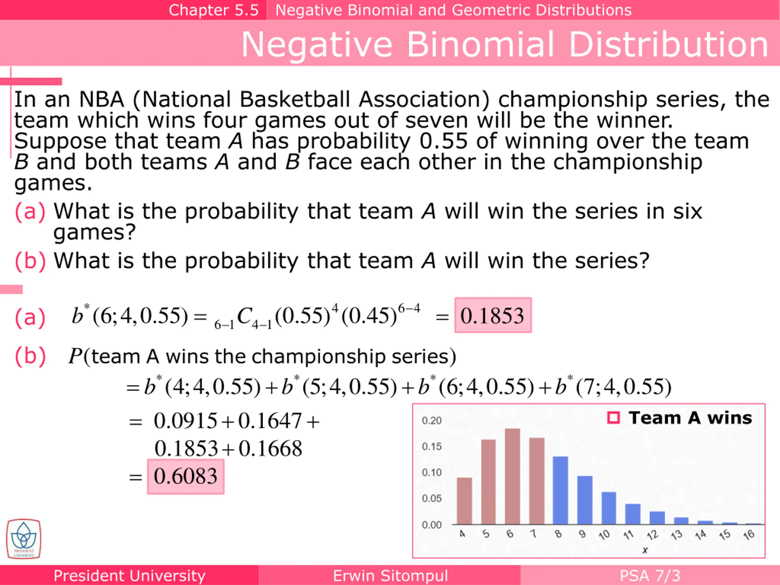 Chapter 5.5 Negative Binomial and Geometric Distributions Negative Binomial Distribution In an NBA (National Basketball Association) championship series, the team which wins four games out of seven will be the winner. Suppose that team A has probability 0.55 of winning over the team B and both teams A and B face each other in the championship games. (a) What is the probability that team A will win the series in six games? (b) What is the probability that team A will win the series? 6 4 = = * 4 (6;4,0.55) (0.55) (0.45) b C 0.1853 (a) 6 1 4 1 (b) ( ) P team A wins the championship series b = + = + + = + + * * * * (4;4,0.55) 0.0915 0.1647 0.1853 0.1668 0.6083 (5;4,0.55) + (6;4,0.55) (7;4,0.55) Team A wins b b b President University Erwin Sitompul PSA 7/3