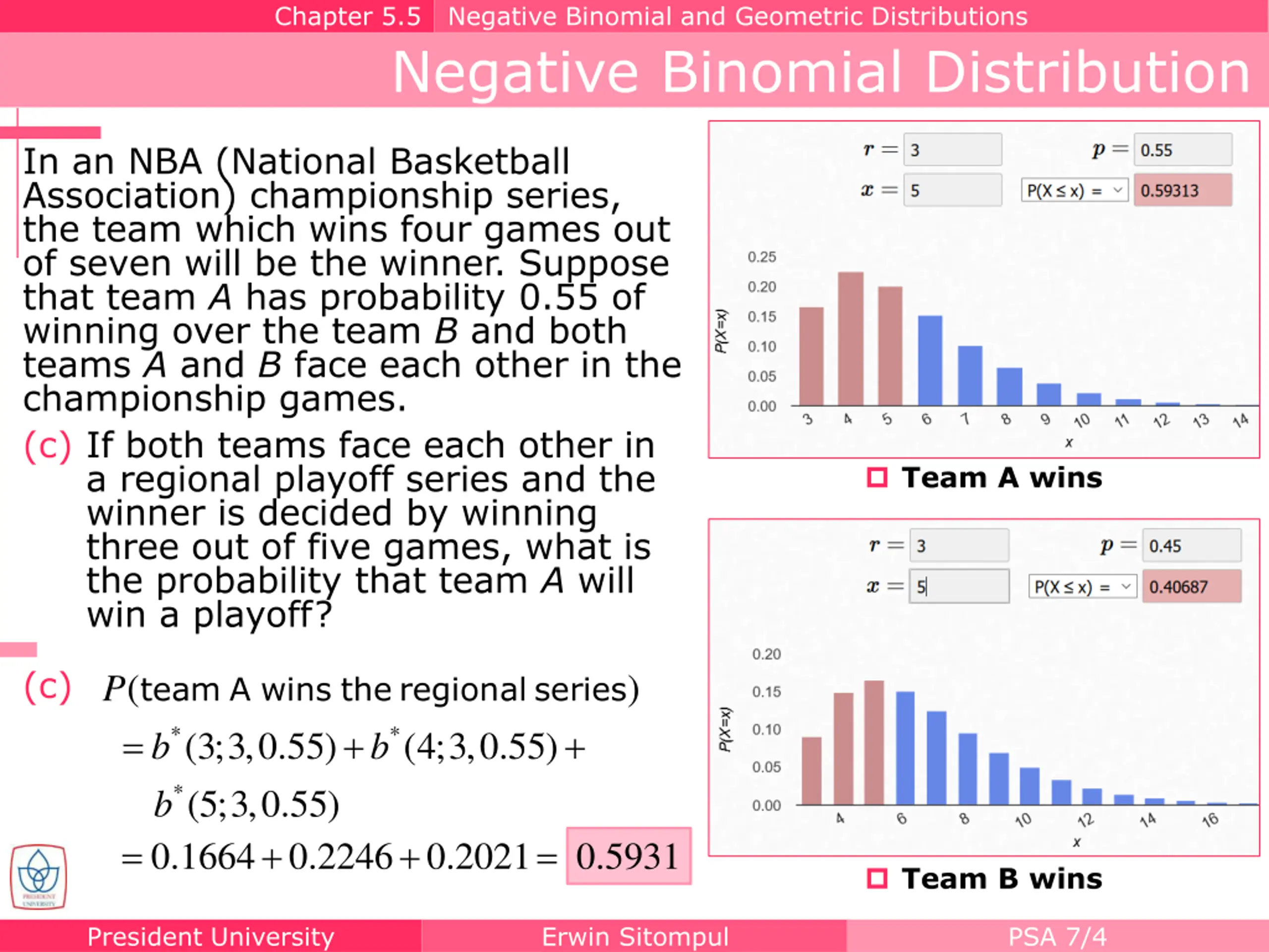 Chapter 5.5 Negative Binomial and Geometric Distributions Negative Binomial Distribution In an NBA (National Basketball Association) championship series, the team which wins four games out of seven will be the winner. Suppose that team A has probability 0.55 of winning over the team B and both teams A and B face each other in the championship games. (c) If both teams face each other in a regional playoff series and the winner is decided by winning three out of five games, what is the probability that team A will win a playoff? Team A wins (c) ( = ) P team A wins the regional series + + * * (3;3,0.55) (5;3,0.55) 0.1664 0.2246 0.2021 + (4;3,0.55) b b b * = + = 0.5931 Team B wins President University Erwin Sitompul PSA 7/4