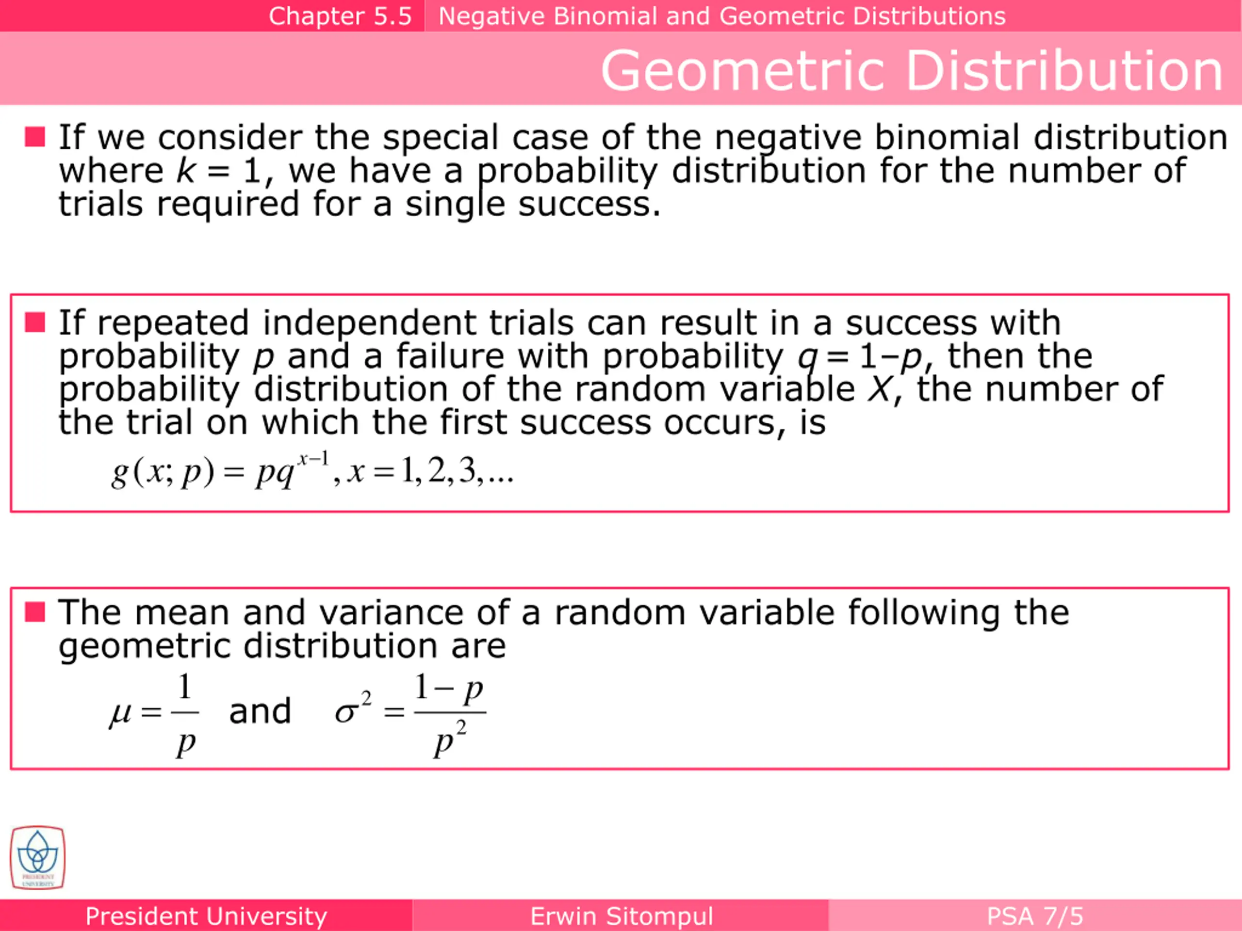 Chapter 5.5 Negative Binomial and Geometric Distributions Geometric Distribution If we consider the special case of the negative binomial distribution where k=1, we have a probability distribution for the number of trials required for a single success. If repeated independent trials can result in a success with probability p and a failure with probability q=1 p, then the probability distribution of the random variable X, the number of the trial on which the first success occurs, is 1 ( ; ) , 1,2,3,... g x p pq x = = x The mean and variance of a random variable following the geometric distribution are 1 1 p p p = = 2 and 2 President University Erwin Sitompul PSA 7/5