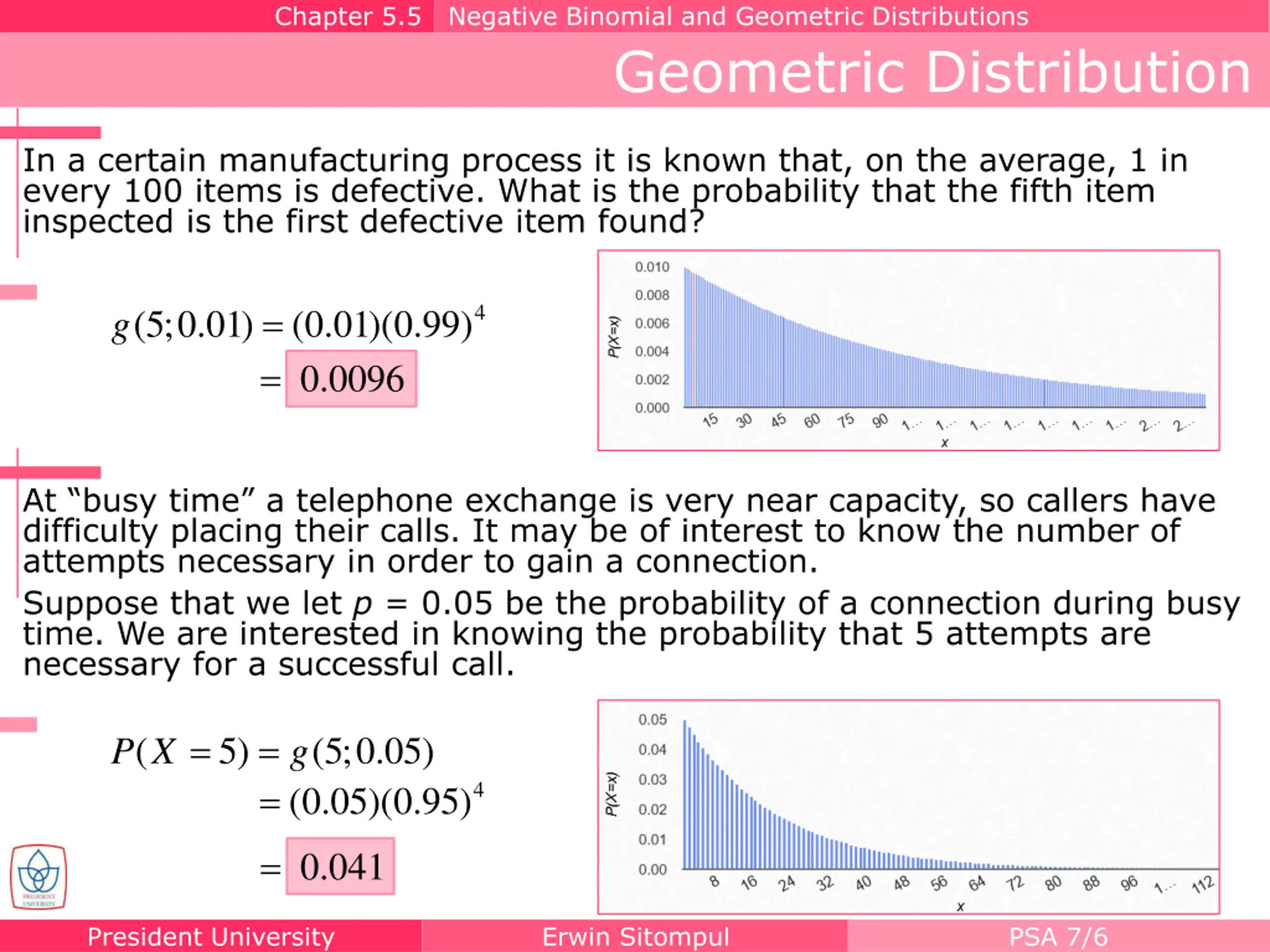 Chapter 5.5 Negative Binomial and Geometric Distributions Geometric Distribution In a certain manufacturing process it is known that, on the average, 1 in every 100 items is defective. What is the probability that the fifth item inspected is the first defective item found? = = 4 (5;0.01) (0.01)(0.99) 0.0096 g At busy time a telephone exchange is very near capacity, so callers have difficulty placing their calls. It may be of interest to know the number of attempts necessary in order to gain a connection. Suppose that we let p = 0.05 be the probability of a connection during busy time. We are interested in knowing the probability that 5 attempts are necessary for a successful call. = = = = ( 5) (5;0.05) (0.05)(0.95) P X g 4 0.041 President University Erwin Sitompul PSA 7/6