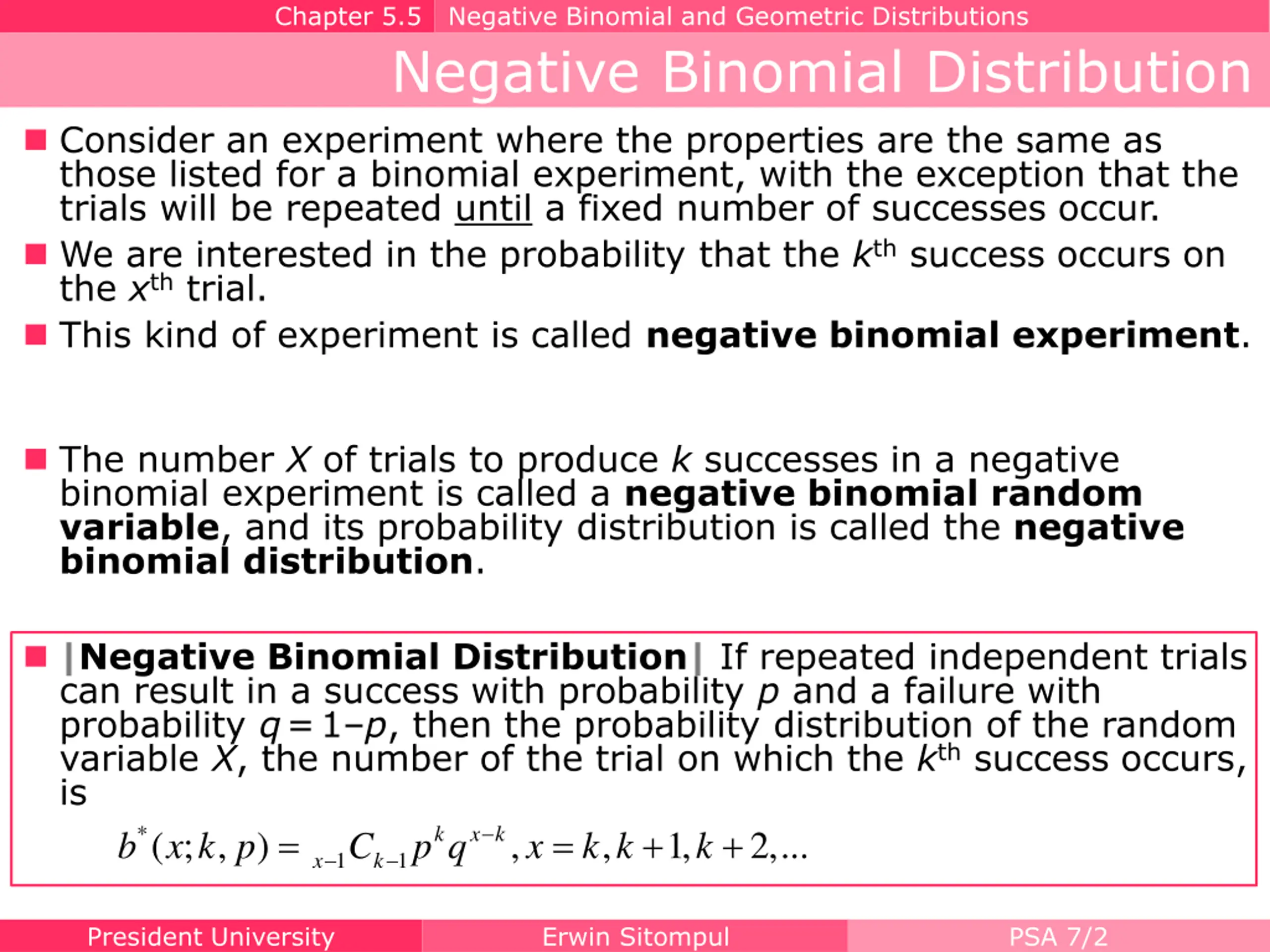 Chapter 5.5 Negative Binomial and Geometric Distributions Negative Binomial Distribution Consider an experiment where the properties are the same as those listed for a binomial experiment, with the exception that the trials will be repeated until a fixed number of successes occur. We are interested in the probability that the kth success occurs on the xth trial. This kind of experiment is called negative binomial experiment. The number X of trials to produce k successes in a negative binomial experiment is called a negative binomial random variable, and its probability distribution is called the negative binomial distribution. |Negative Binomial Distribution| If repeated independent trials can result in a success with probability p and a failure with probability q=1 p, then the probability distribution of the random variable X, the number of the trial on which the kth success occurs, is x k = = + + * k ( ; , ) b x k p , , 1, 2,... C p q x k k k 1 1 x k President University Erwin Sitompul PSA 7/2