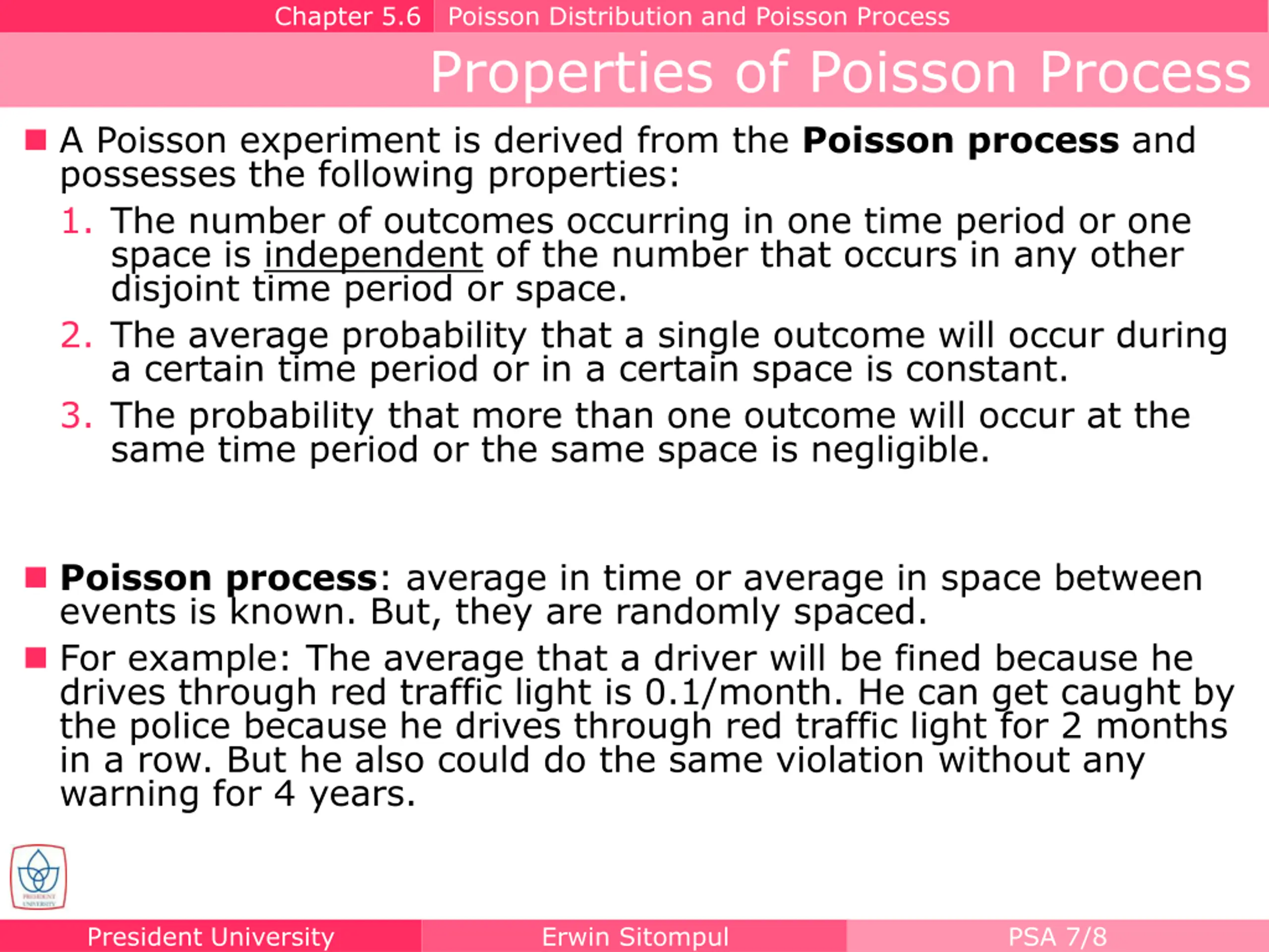 Chapter 5.6 Poisson Distribution and Poisson Process Properties of Poisson Process A Poisson experiment is derived from the Poisson process and possesses the following properties: 1. The number of outcomes occurring in one time period or one space is independent of the number that occurs in any other disjoint time period or space. 2. The average probability that a single outcome will occur during a certain time period or in a certain space is constant. 3. The probability that more than one outcome will occur at the same time period or the same space is negligible. Poisson process: average in time or average in space between events is known. But, they are randomly spaced. For example: The average that a driver will be fined because he drives through red traffic light is 0.1/month. He can get caught by the police because he drives through red traffic light for 2 months in a row. But he also could do the same violation without any warning for 4 years. President University Erwin Sitompul PSA 7/8