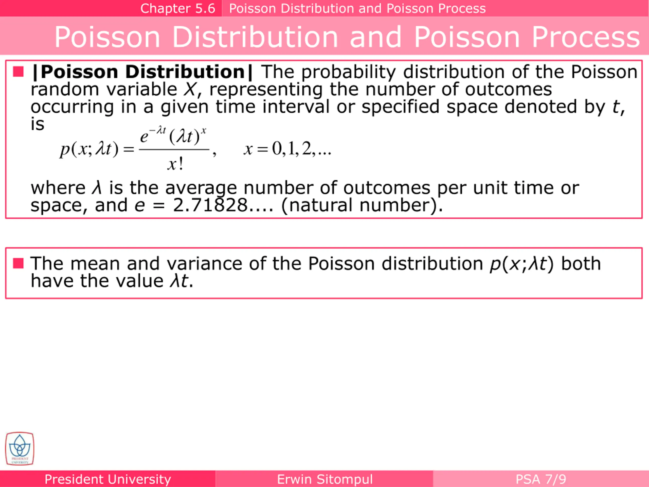 Chapter 5.6 Poisson Distribution and Poisson Process Poisson Distribution and Poisson Process |Poisson Distribution| The probability distribution of the Poisson random variable X, representing the number of outcomes occurring in a given time interval or specified space denoted by t, is ( ) ( ; ) , 0,1,2,... ! x where is the average number of outcomes per unit time or space, and e = 2.71828.... (natural number). t x e t = = p x t x The mean and variance of the Poisson distribution p(x; t) both have the value t. President University Erwin Sitompul PSA 7/9