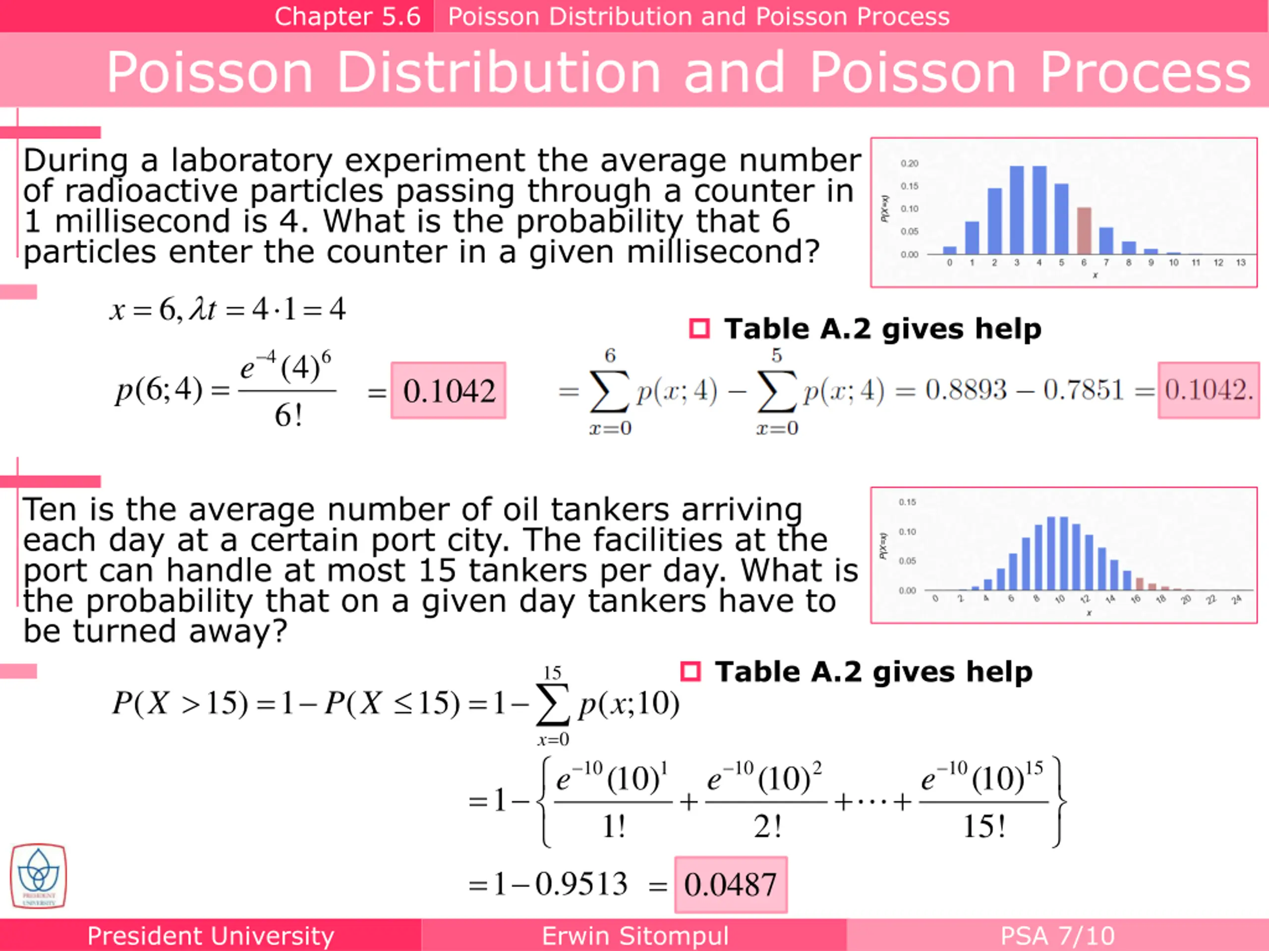 Chapter 5.6 Poisson Distribution and Poisson Process Poisson Distribution and Poisson Process During a laboratory experiment the average number of radioactive particles passing through a counter in 1 millisecond is 4. What is the probability that 6 particles enter the counter in a given millisecond? t = = = 6, 4 1 4 x Table A.2 gives help 4 6 (4) 6! e = = (6;4) p 0.1042 Ten is the average number of oil tankers arriving each day at a certain port city. The facilities at the port can handle at most 15 tankers per day. What is the probability that on a given day tankers have to be turned away? Table A.2 gives help 15 = = ( 15) 1 ( 15) 1 ( ;10) p x P X P X = 0 e x 10 1 10 2 10 15 (10) 1! (10) 2! (10) 15! e e = + + + 1 1 0.9513 = = 0.0487 President University Erwin Sitompul PSA 7/10