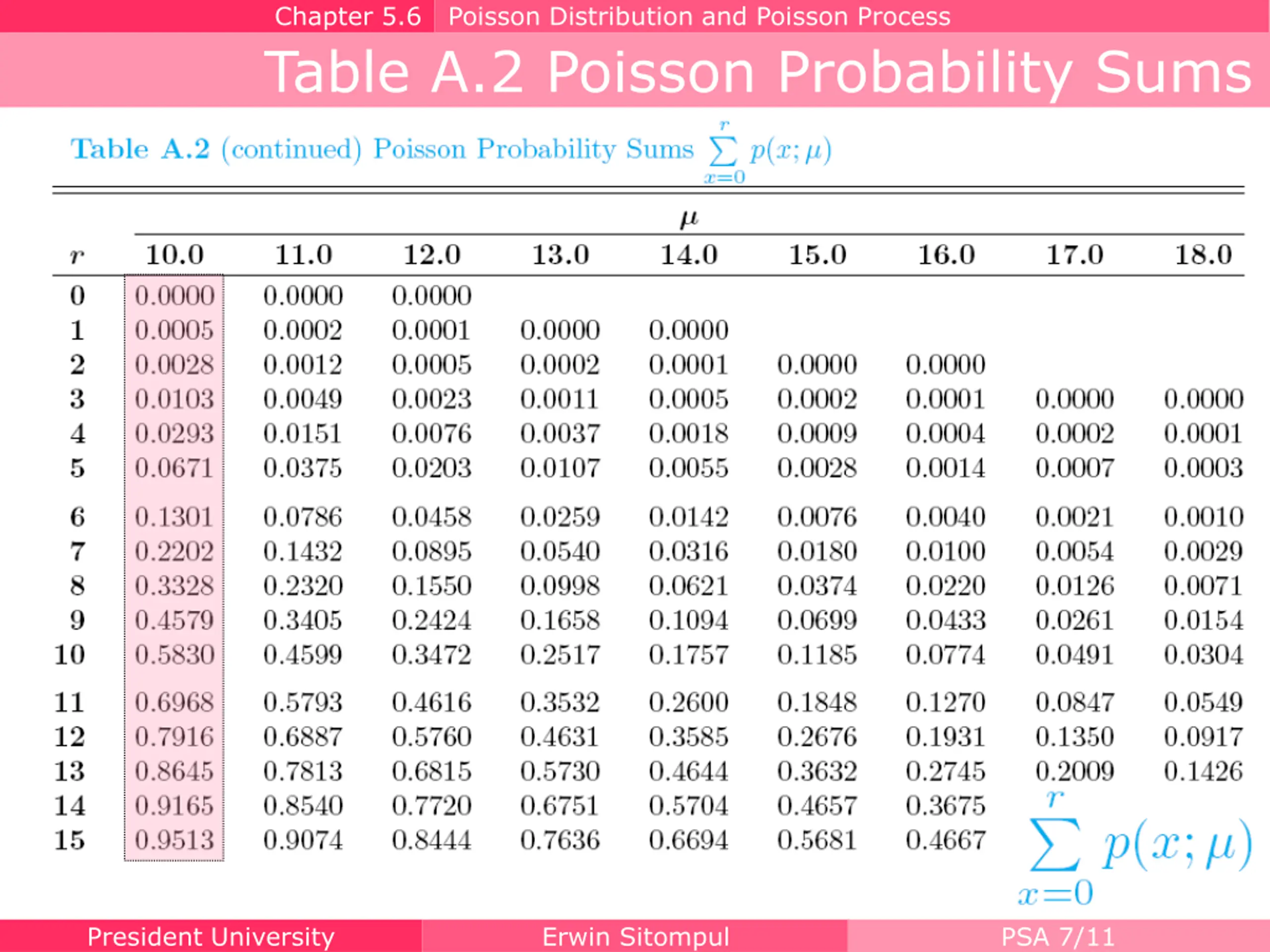 Chapter 5.6 Poisson Distribution and Poisson Process Table A.2 Poisson Probability Sums President University Erwin Sitompul PSA 7/11