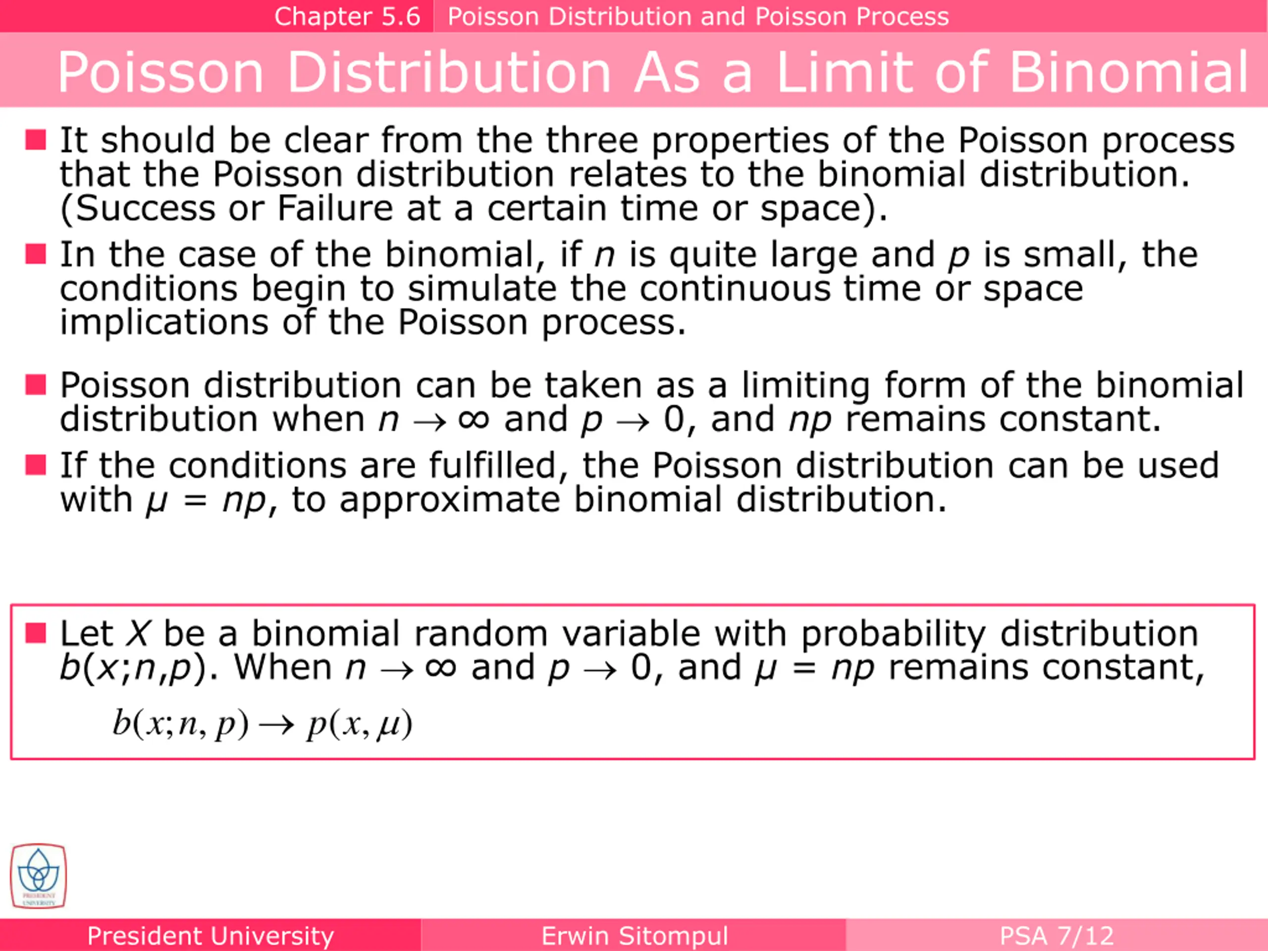 Chapter 5.6 Poisson Distribution and Poisson Process Poisson Distribution As a Limit of Binomial It should be clear from the three properties of the Poisson process that the Poisson distribution relates to the binomial distribution. (Success or Failure at a certain time or space). In the case of the binomial, if n is quite large and p is small, the conditions begin to simulate the continuous time or space implications of the Poisson process. Poisson distribution can be taken as a limiting form of the binomial distribution when n and p 0, and np remains constant. If the conditions are fulfilled, the Poisson distribution can be used with = np, to approximate binomial distribution. Let X be a binomial random variable with probability distribution b(x;n,p). When n and p 0, and = np remains constant, ( ; , ) ( , ) b x n p p x President University Erwin Sitompul PSA 7/12