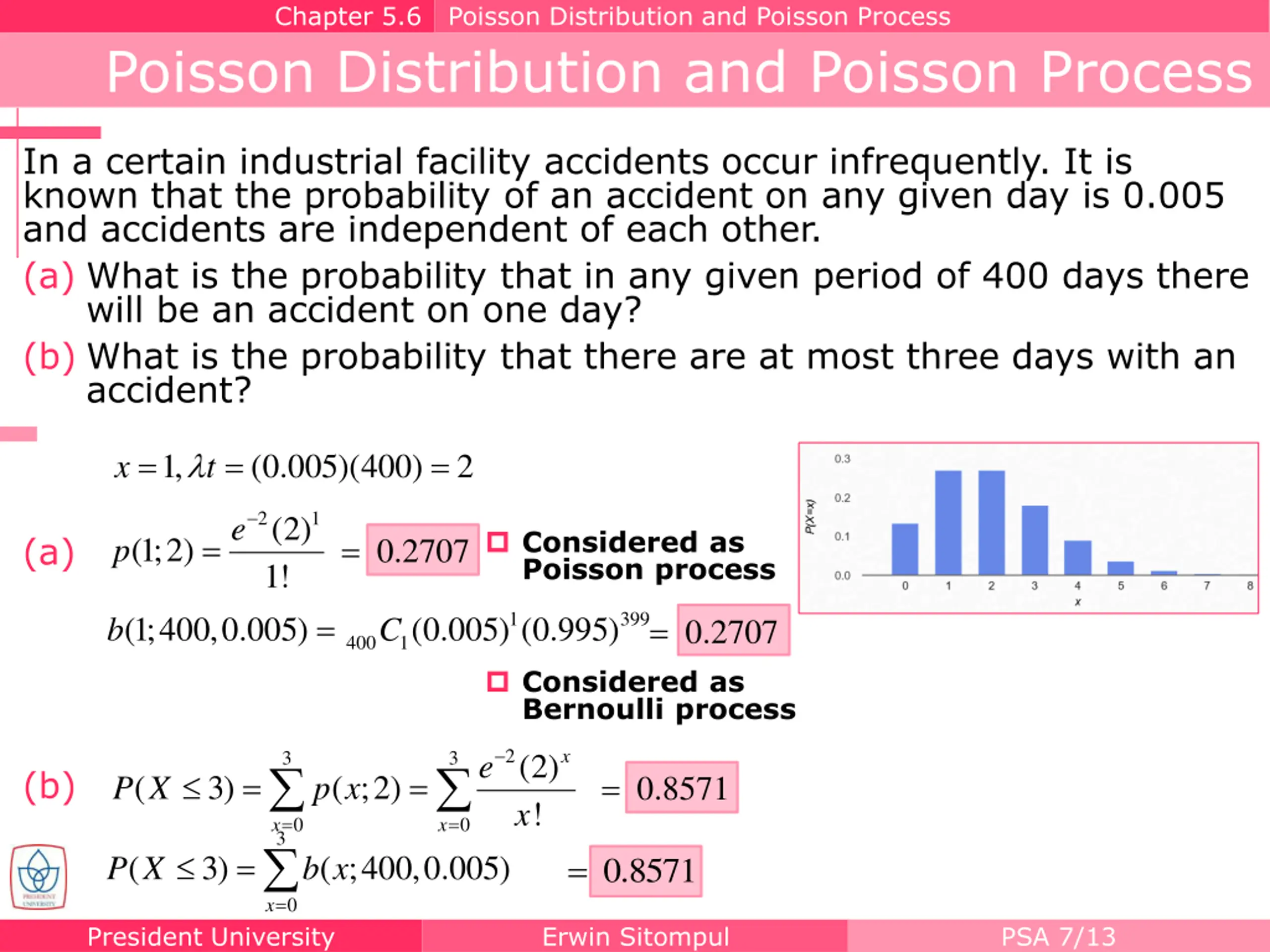 Chapter 5.6 Poisson Distribution and Poisson Process Poisson Distribution and Poisson Process In a certain industrial facility accidents occur infrequently. It is known that the probability of an accident on any given day is 0.005 and accidents are independent of each other. (a) What is the probability that in any given period of 400 days there will be an accident on one day? (b) What is the probability that there are at most three days with an accident? = t = = 1, (0.005)(400) 2 x 2 1 (2) 1! e Considered as Poisson process = = (a) (1;2) p 0.2707 = 1 399 = (1;400,0.005) (0.005) (0.995) b C 0.2707 400 1 Considered as Bernoulli process 2 x 3 3 (2) ! x e (b) = = = ( 3) ( ;2) p x P X 0.8571 = = 0 0 x 3 x = = ( 3) ( ;400,0.005) b x P X 0.8571 = 0 x President University Erwin Sitompul PSA 7/13