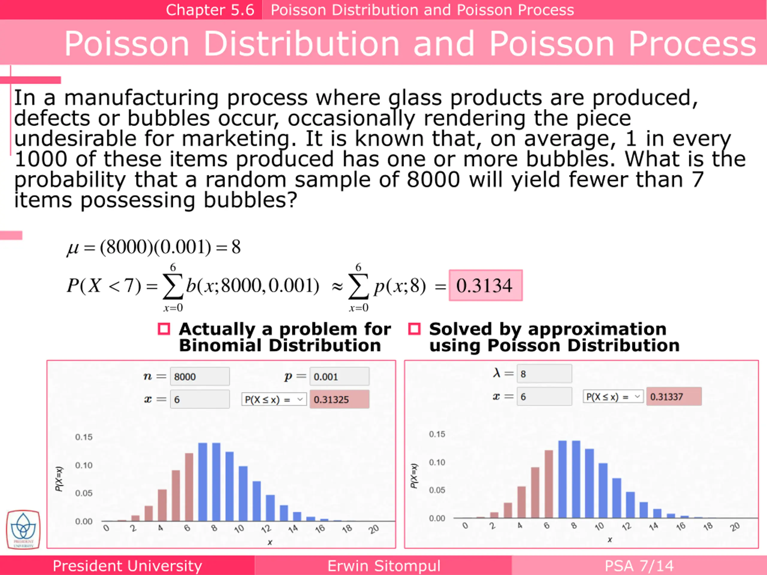 Chapter 5.6 Poisson Distribution and Poisson Process Poisson Distribution and Poisson Process In a manufacturing process where glass products are produced, defects or bubbles occur, occasionally rendering the piece undesirable for marketing. It is known that, on average, 1 in every 1000 of these items produced has one or more bubbles. What is the probability that a random sample of 8000 will yield fewer than 7 items possessing bubbles? = = (8000)(0.001) 8 6 6 = = ( 7) ( ;8000,0.001) b x ( ;8) p x P X 0.3134 = = 0 0 x x Actually a problem for Binomial Distribution Solved by approximation using Poisson Distribution President University Erwin Sitompul PSA 7/14
