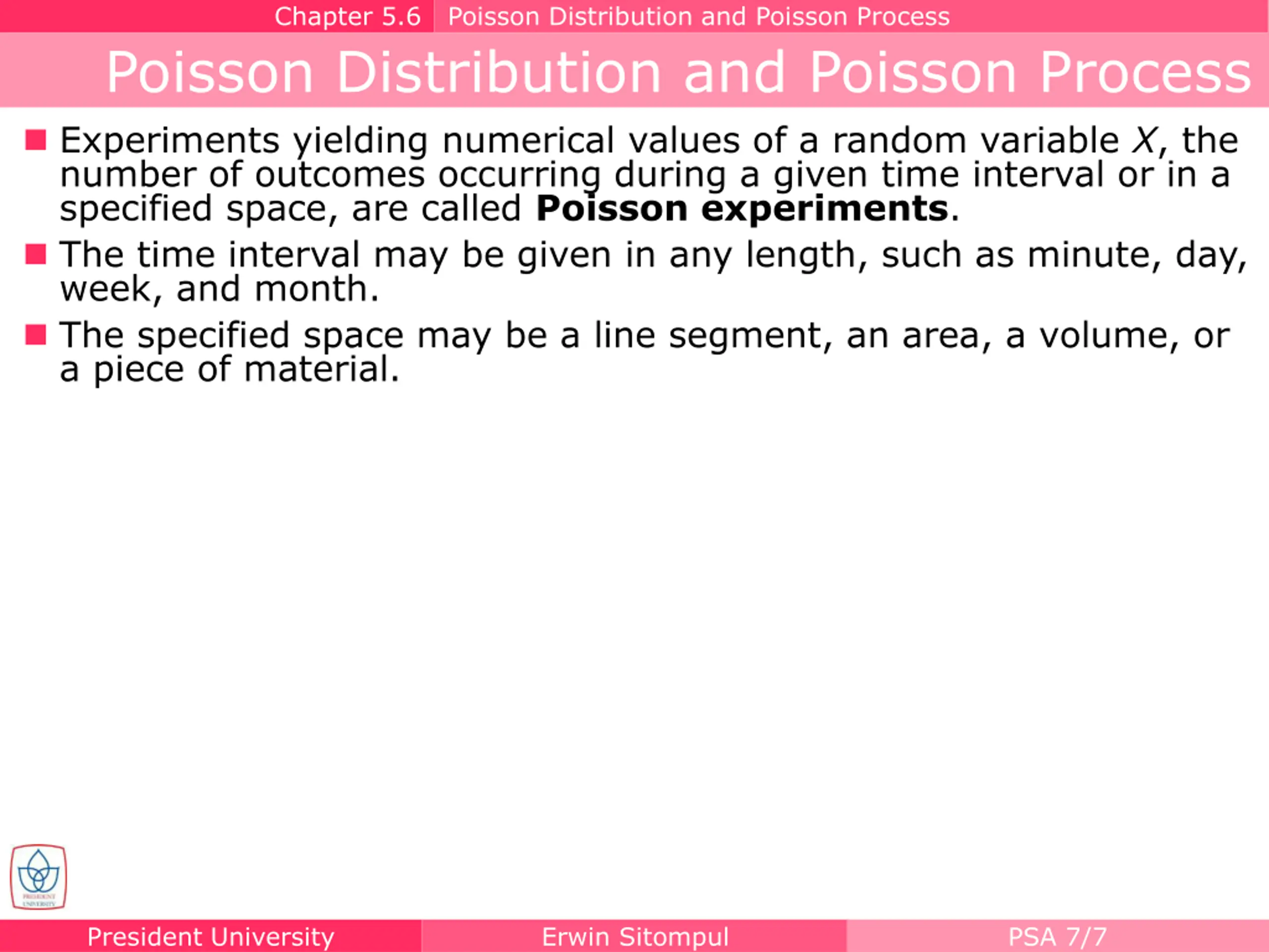 Chapter 5.6 Poisson Distribution and Poisson Process Poisson Distribution and Poisson Process Experiments yielding numerical values of a random variable X, the number of outcomes occurring during a given time interval or in a specified space, are called Poisson experiments. The time interval may be given in any length, such as minute, day, week, and month. The specified space may be a line segment, an area, a volume, or a piece of material. President University Erwin Sitompul PSA 7/7