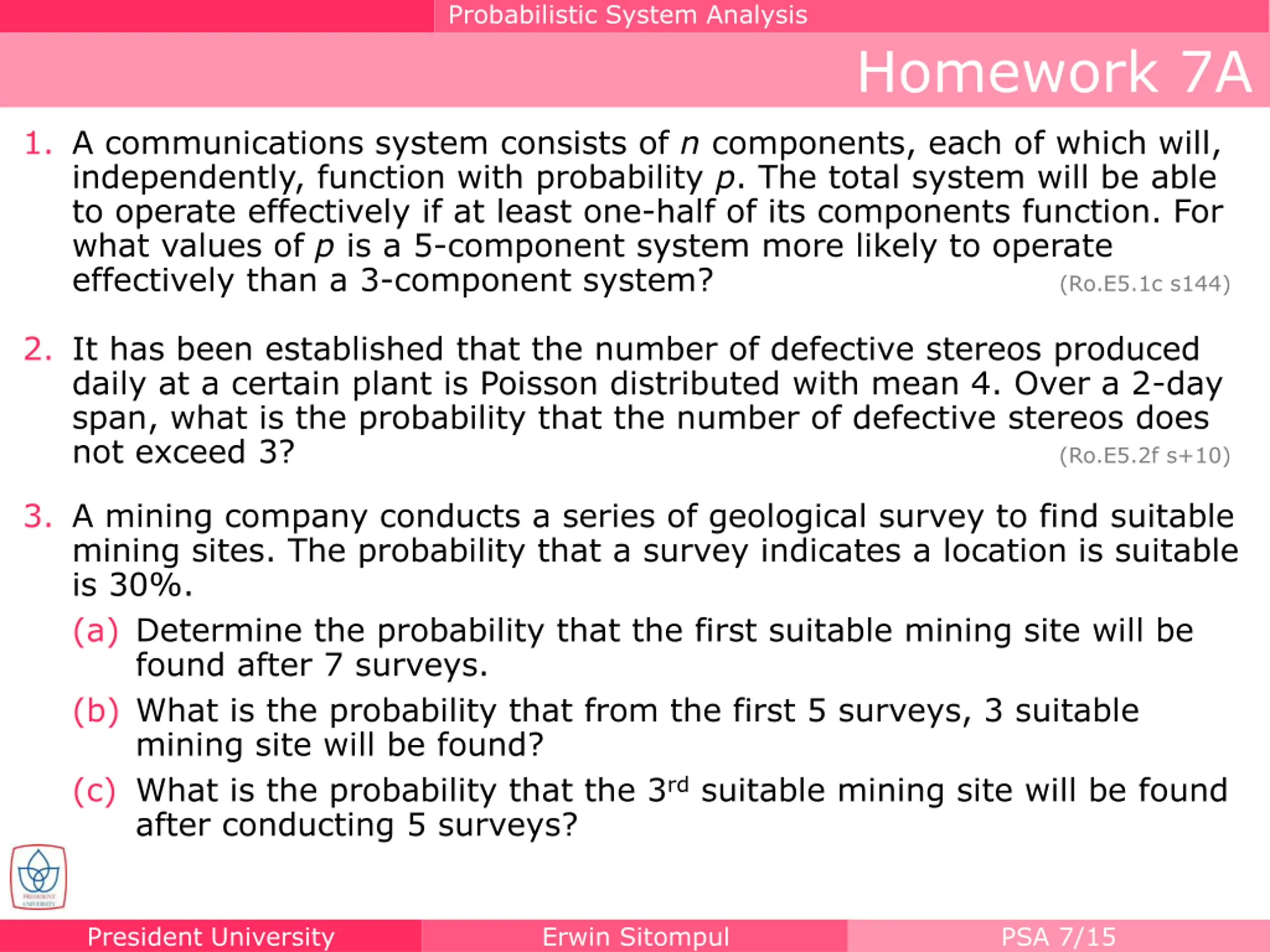 Probabilistic System Analysis Homework 7A 1. A communications system consists of n components, each of which will, independently, function with probability p. The total system will be able to operate effectively if at least one-half of its components function. For what values of p is a 5-component system more likely to operate effectively than a 3-component system? (Ro.E5.1c s144) 2. It has been established that the number of defective stereos produced daily at a certain plant is Poisson distributed with mean 4. Over a 2-day span, what is the probability that the number of defective stereos does not exceed 3? (Ro.E5.2f s+10) 3. A mining company conducts a series of geological survey to find suitable mining sites. The probability that a survey indicates a location is suitable is 30%. (a) Determine the probability that the first suitable mining site will be found after 7 surveys. (b) What is the probability that from the first 5 surveys, 3 suitable mining site will be found? (c) What is the probability that the 3rd suitable mining site will be found after conducting 5 surveys? President University Erwin Sitompul PSA 7/15