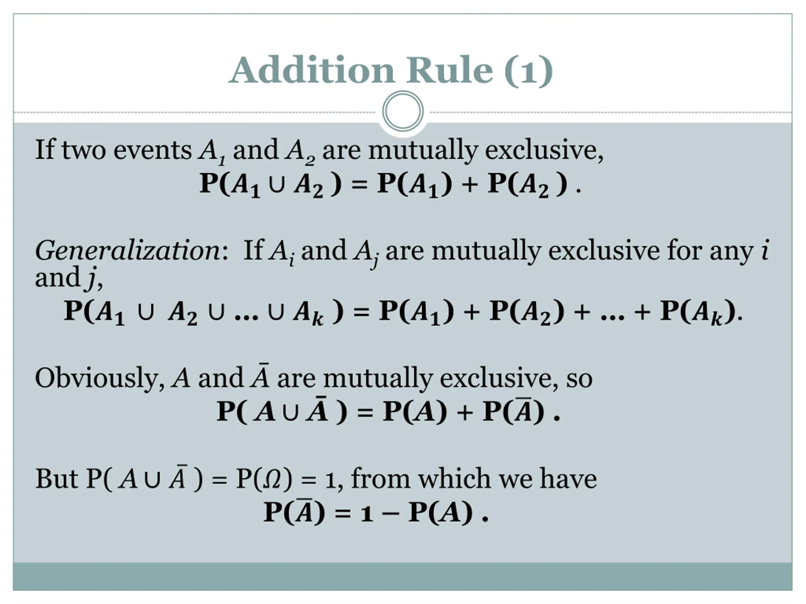 Addition Rule (1) If two events A1and A2are mutually exclusive, P(?? ??) = P(??) + P(??) . Generalization: If Aiand Ajare mutually exclusive for any i and j, P(?? ?? ??) = P(??) + P(??) + + P(??). Obviously, A and are mutually exclusive, so P( A ) = P(A) + P( ?) . But P( A ? ) = P(?) = 1, from which we have P( ?) = 1 P(A) .