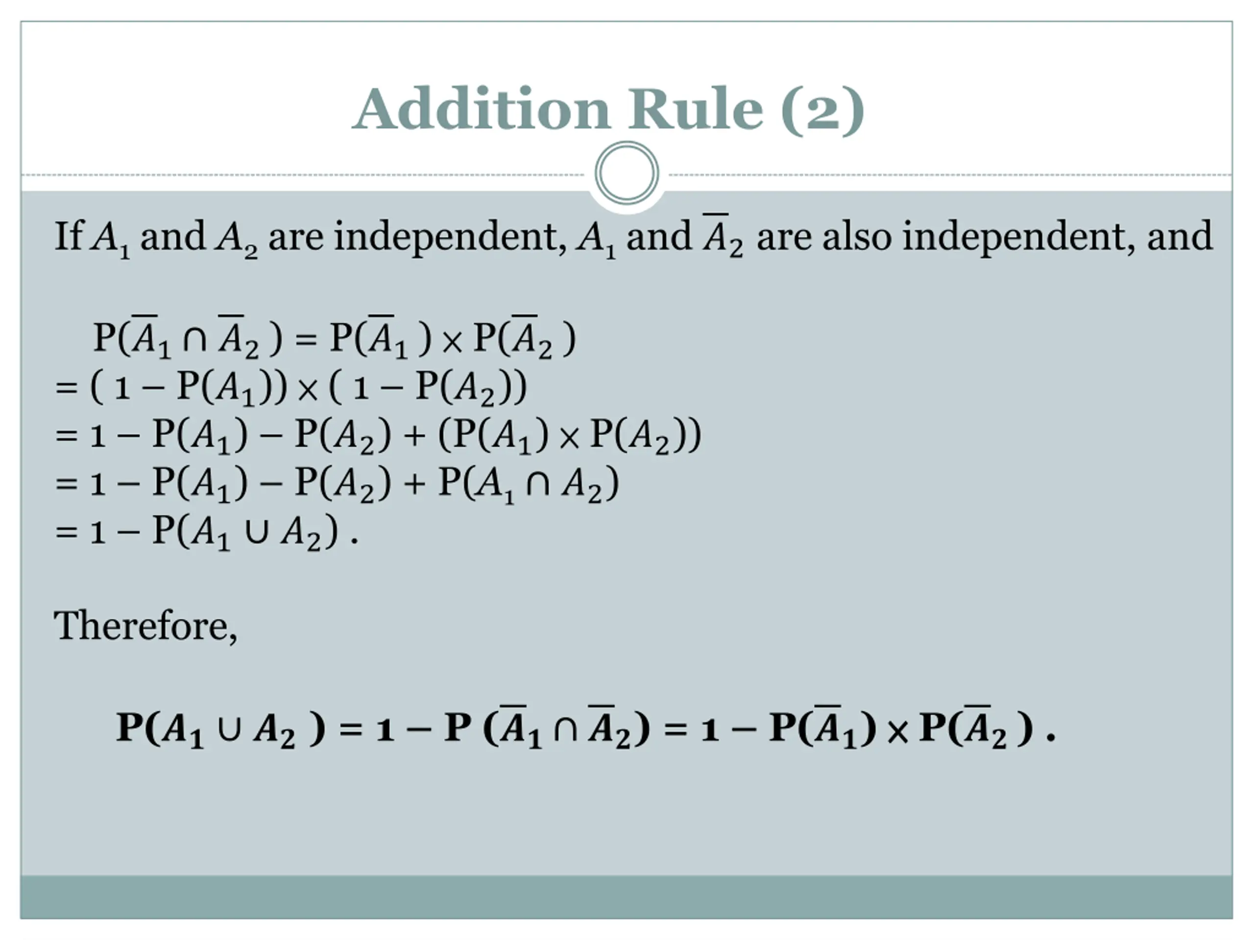 Addition Rule (2) If A1and A2are independent, A1and ?2are also independent, and P(?1 ?2) = P(?1) P(?2) = ( 1 P(?1)) ( 1 P(?2)) = 1 P(?1) P(?2) + (P(?1) P(?2)) = 1 P(?1) P(?2) + P(A1 ?2) = 1 P(?1 ?2) . Therefore, P(?? ??) = 1 P (?? ??) = 1 P(??) P(??) .