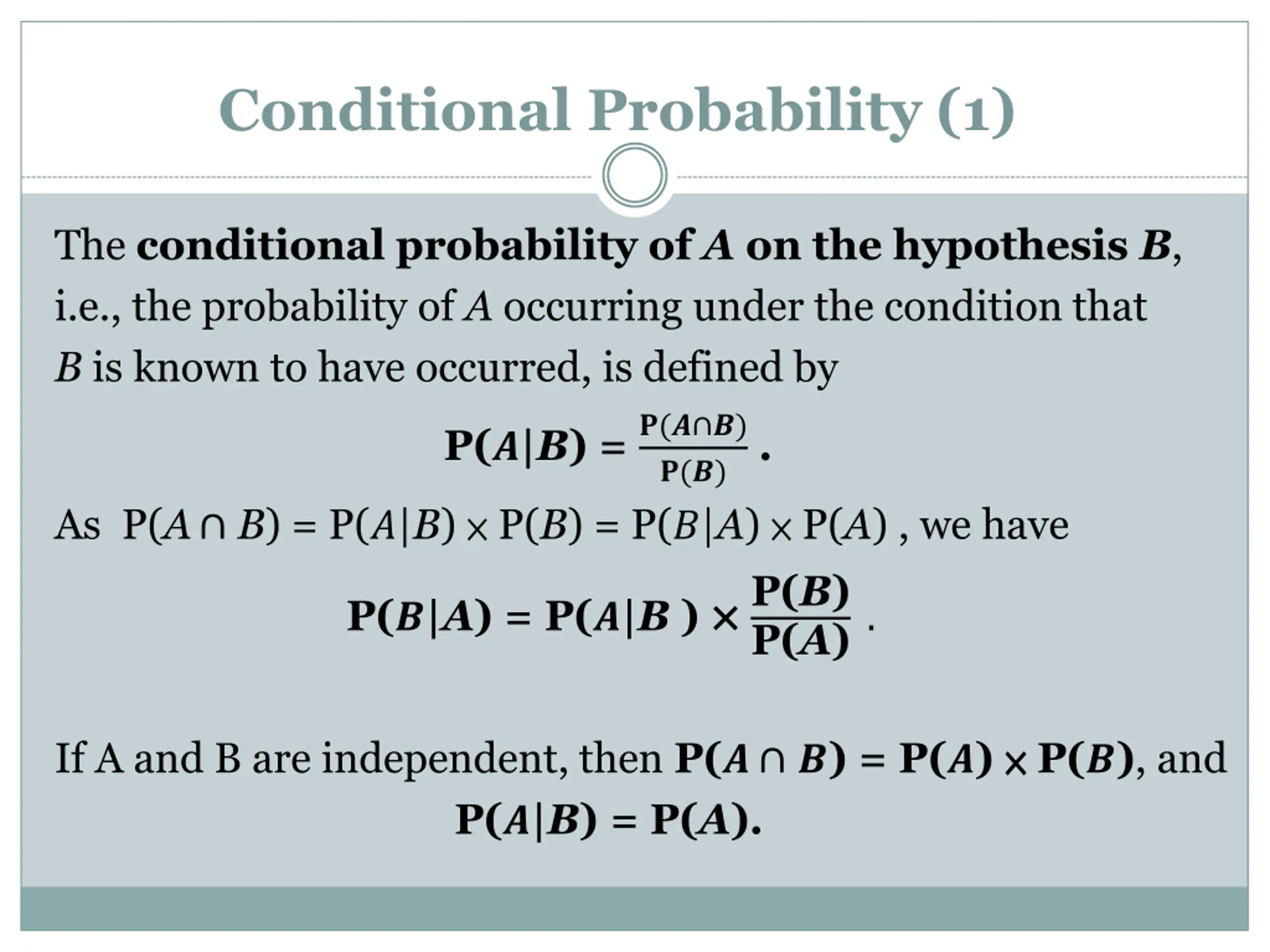 Conditional Probability (1) The conditional probability of A on the hypothesis B, i.e., the probability of A occurring under the condition that B is known to have occurred, is defined by P(?|B) = ?(? ?) ?(?). As P(A B) = P(?|B) P(B) = P(?|A) P(A) , we have P(?|A) = P(?|B ) P(B) P(A). If A and B are independent, then P(? ?) = P(?) P(?), and P(?|B) = P(A).