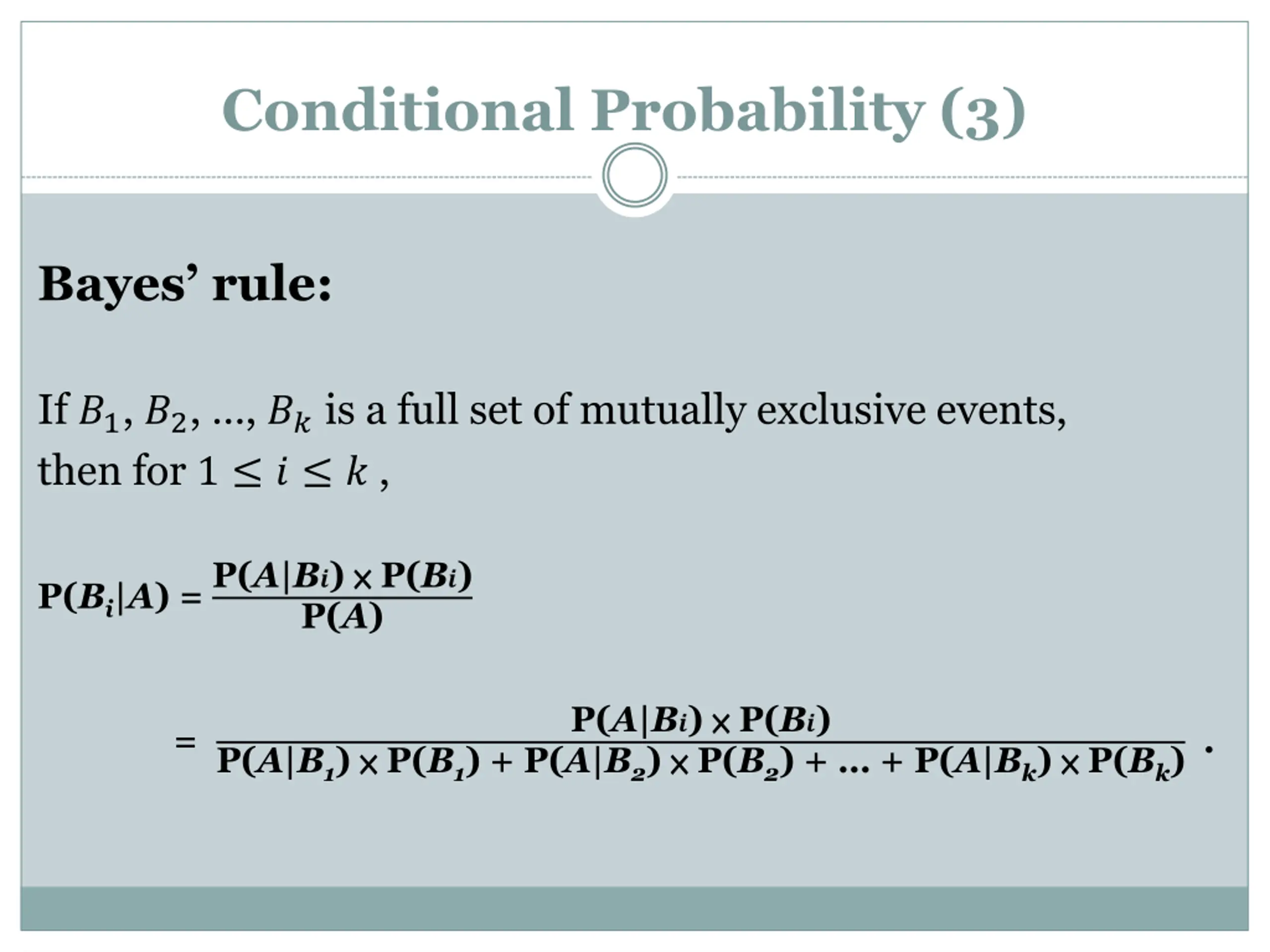 Conditional Probability (3) Bayes rule: If ?1, ?2, , ??is a full set of mutually exclusive events, then for 1 ? ? , P(Bi|A) = P(A|B?) P(B?) P(A) P(A|B?) P(B?) = P(A|B1) P(B1) + P(A|B2) P(B2) + + P(A|Bk) P(Bk).
