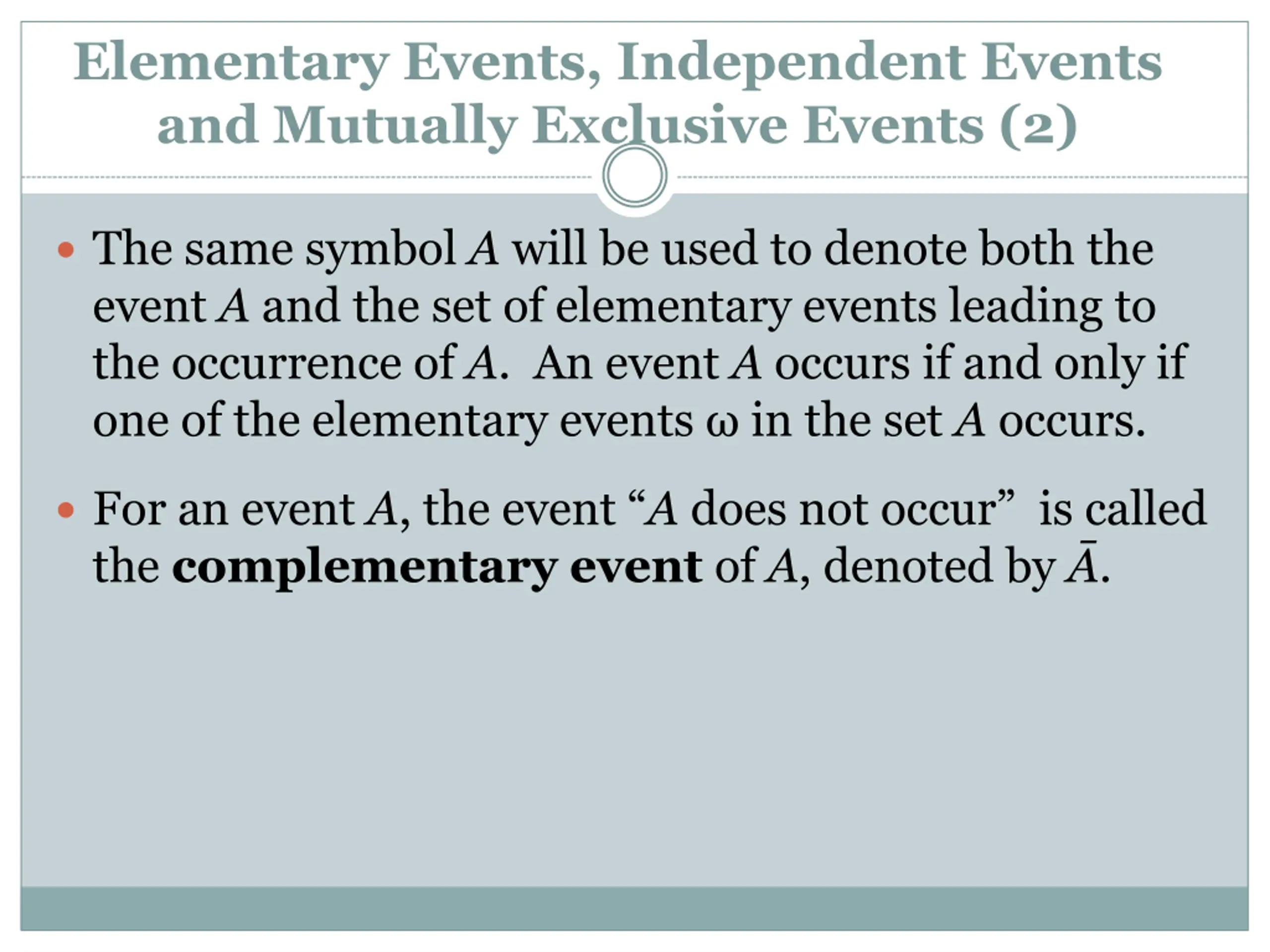 Elementary Events, Independent Events and Mutually Exclusive Events (2) The same symbol A will be used to denote both the event A and the set of elementary events leading to the occurrence of A. An event A occurs if and only if one of the elementary events in the set A occurs. For an event A, the event A does not occur is called the complementary event of A, denoted by .