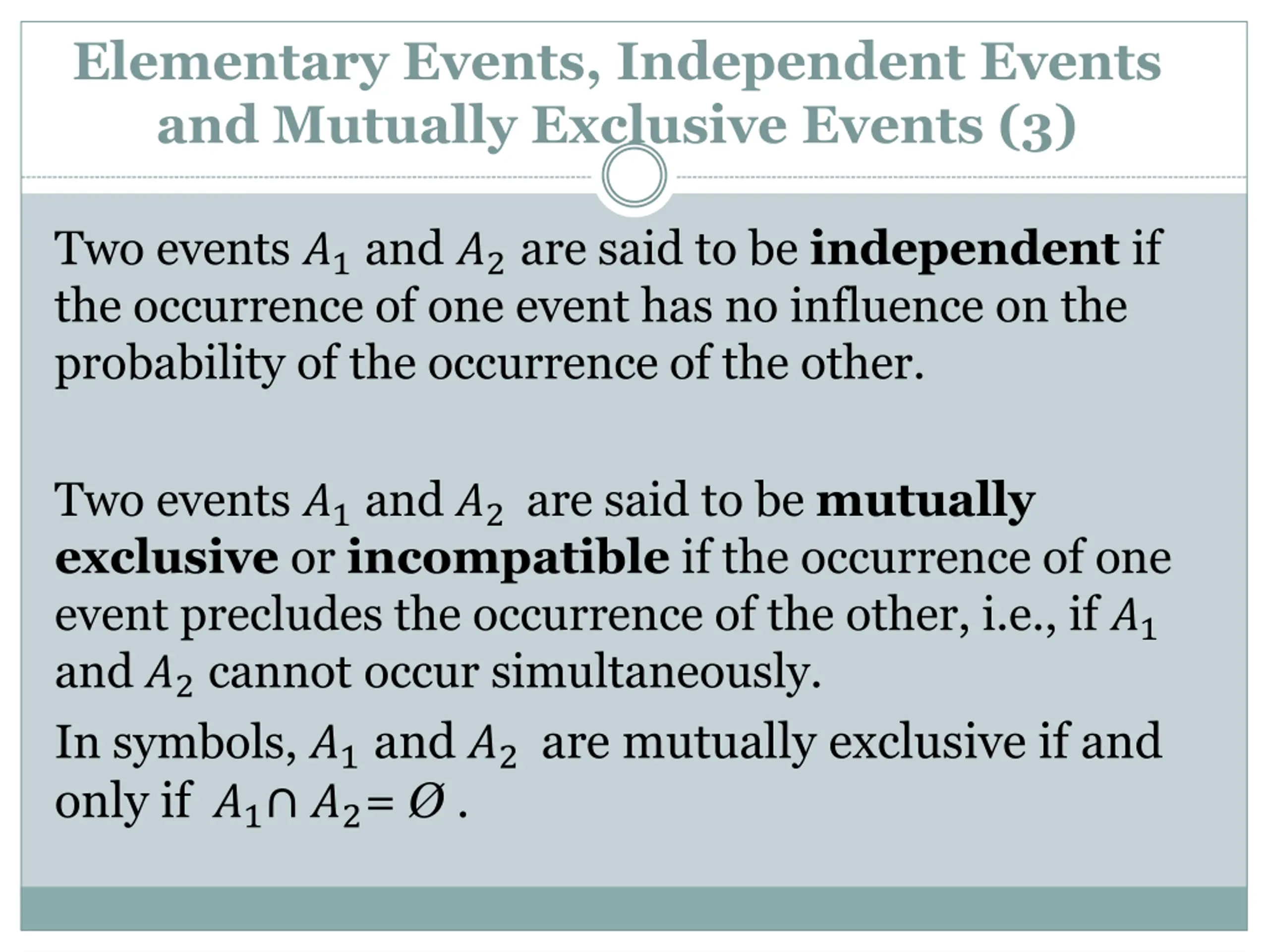 Elementary Events, Independent Events and Mutually Exclusive Events (3) Two events ?1and ?2are said to be independent if the occurrence of one event has no influence on the probability of the occurrence of the other. Two events ?1and ?2are said to be mutually exclusive or incompatible if the occurrence of one event precludes the occurrence of the other, i.e., if ?1 and ?2cannot occur simultaneously. In symbols, ?1and ?2are mutually exclusive if and only if ?1 ?2= .
