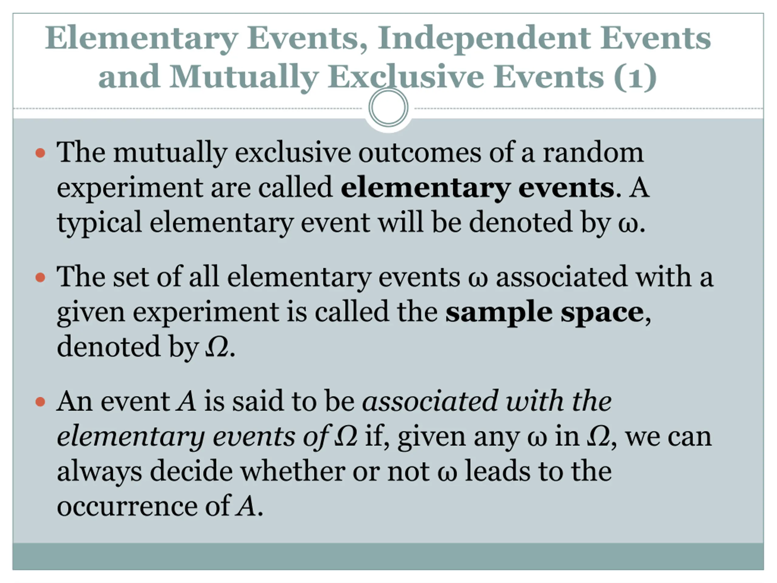 Elementary Events, Independent Events and Mutually Exclusive Events (1) The mutually exclusive outcomes of a random experiment are called elementary events. A typical elementary event will be denoted by . The set of all elementary events associated with a given experiment is called the sample space, denoted by . An event A is said to be associated with the elementary events of if, given any in , we can always decide whether or not leads to the occurrence of A.