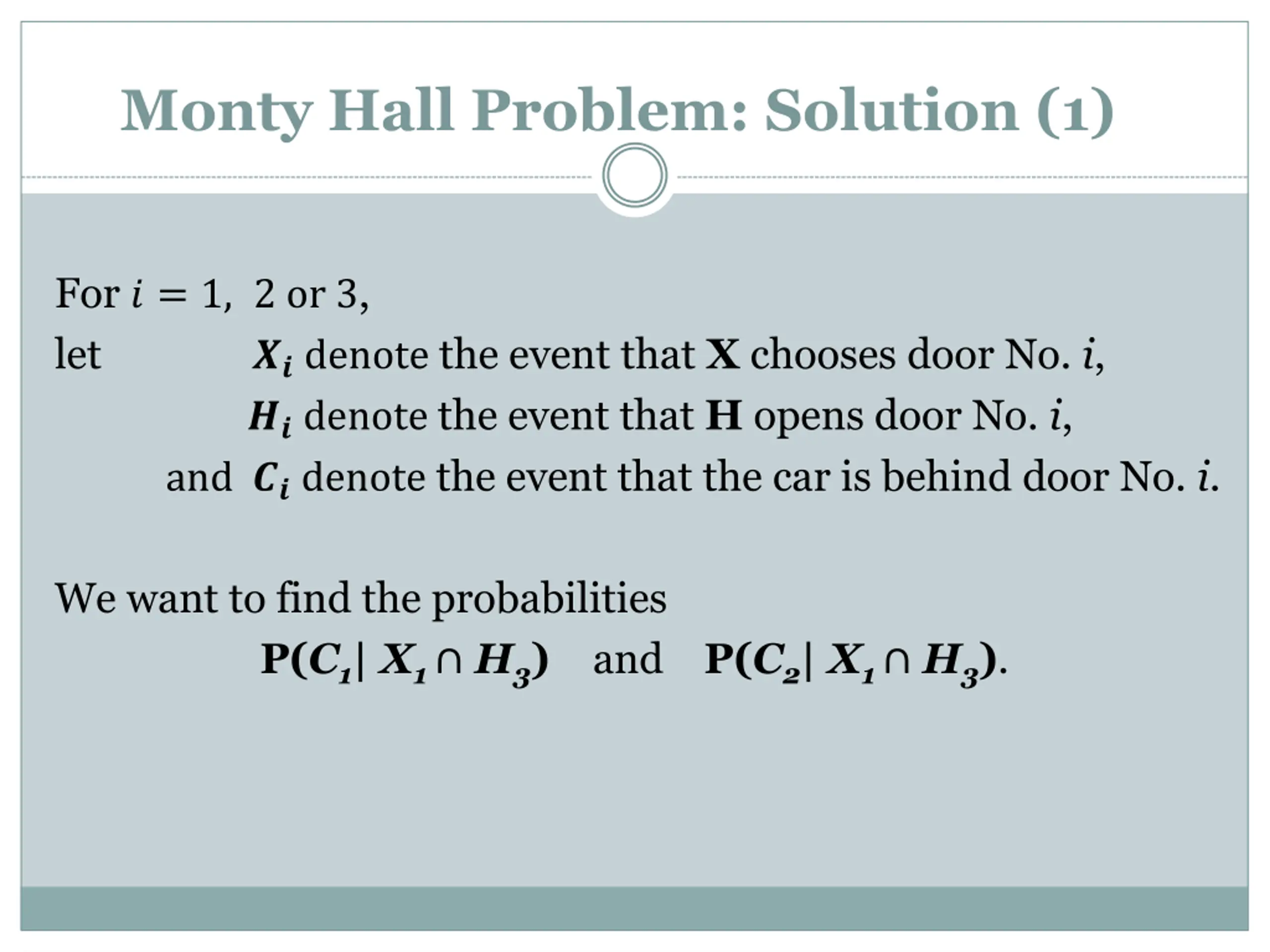 Monty Hall Problem: Solution (1) For ? = 1, 2 or 3, let ??denote the event that X chooses door No. i, ??denote the event that H opens door No. i, and ??denote the event that the car is behind door No. i. We want to find the probabilities P(C1| X1 H3) and P(C2| X1 H3).