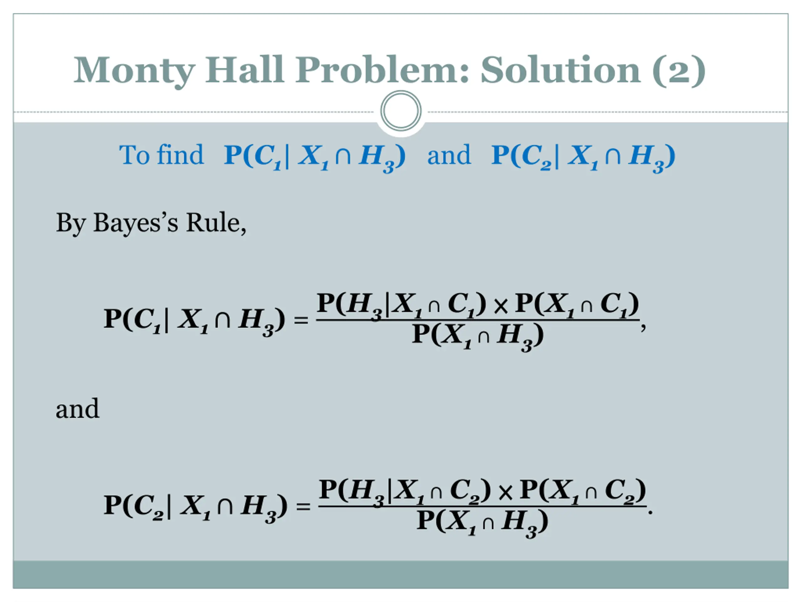 Monty Hall Problem: Solution (2) To find P(C1| X1 H3) and P(C2| X1 H3) By Bayes s Rule, P(C1| X1 H3) =P(H3|X1 C1) P(X1 C1) , P(X1 H3) and P(C2| X1 H3) =P(H3|X1 C2) P(X1 C2) . P(X1 H3)