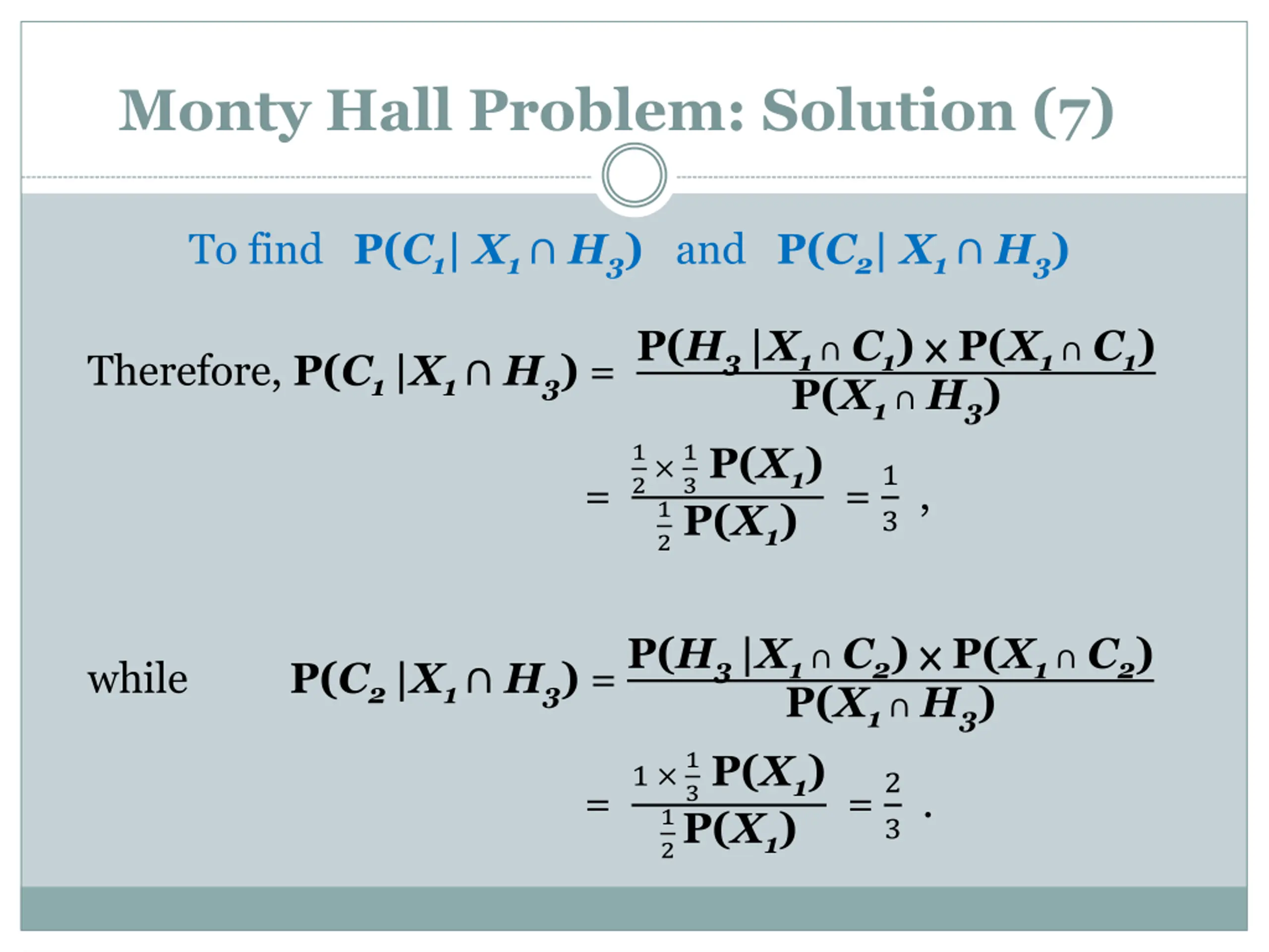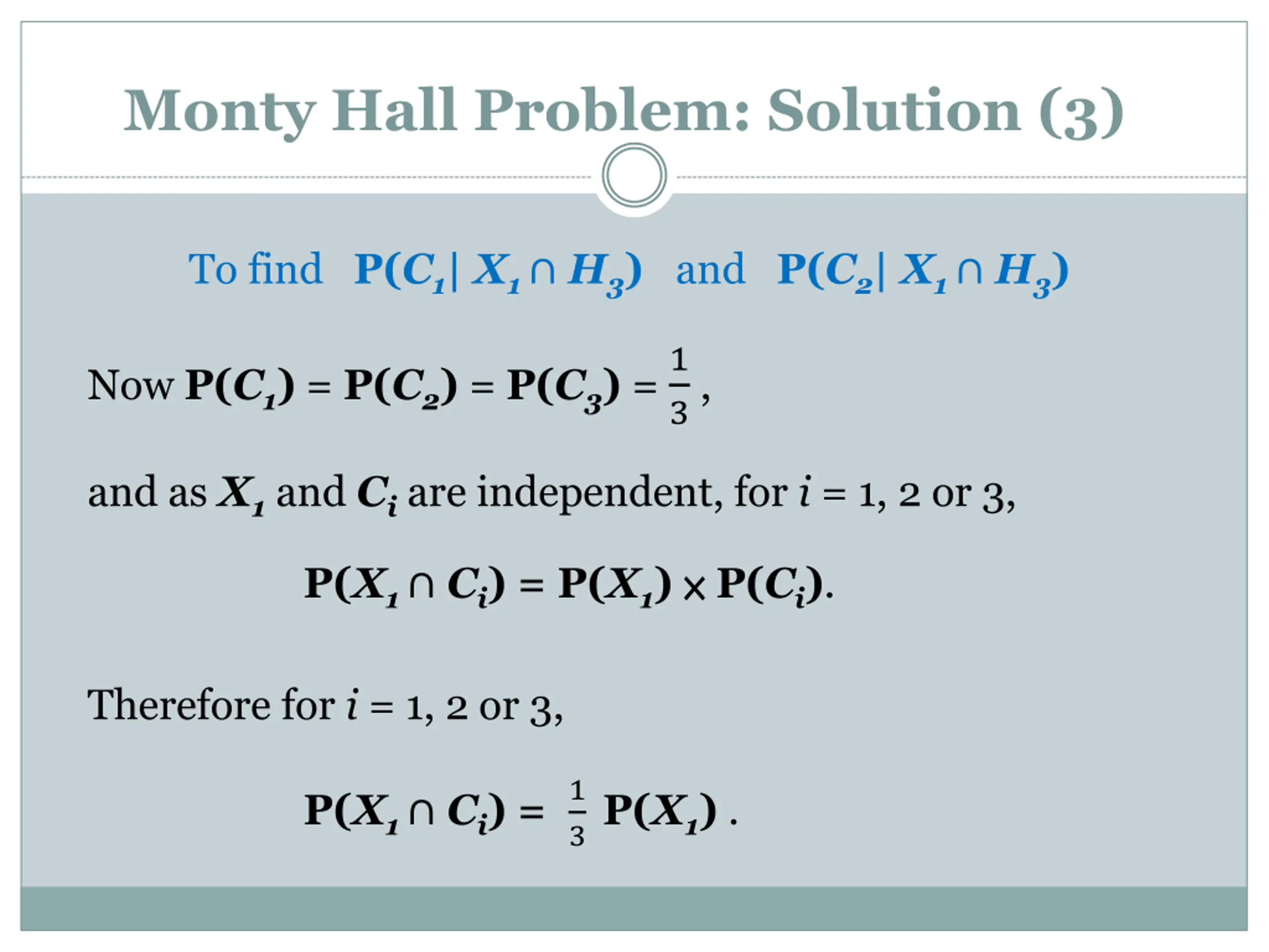 Monty Hall Problem: Solution (3) To find P(C1| X1 H3) and P(C2| X1 H3) Now P(C1) = P(C2) = P(C3) = 1 3, and as X1and Ciare independent, for i = 1, 2 or 3, P(X1 Ci) = P(X1) P(Ci). Therefore for i = 1, 2 or 3, P(X1 Ci) = 1 3P(X1) .