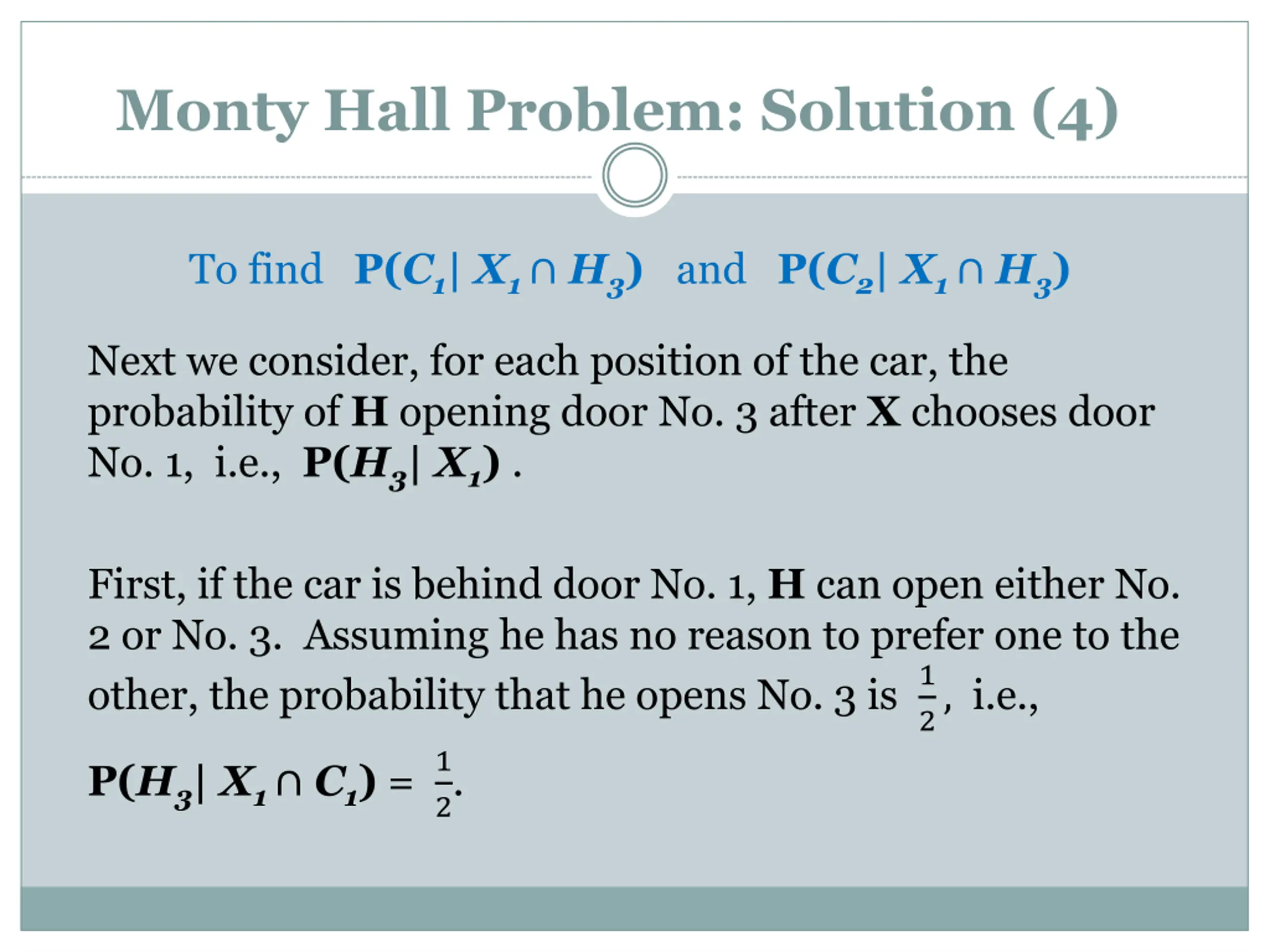 Monty Hall Problem: Solution (4) To find P(C1| X1 H3) and P(C2| X1 H3) Next we consider, for each position of the car, the probability of H opening door No. 3 after X chooses door No. 1, i.e., P(H3| X1) . First, if the car is behind door No. 1, H can open either No. 2 or No. 3. Assuming he has no reason to prefer one to the other, the probability that he opens No. 3 is 1 2, i.e., P(H3| X1 C1) = 1 2.