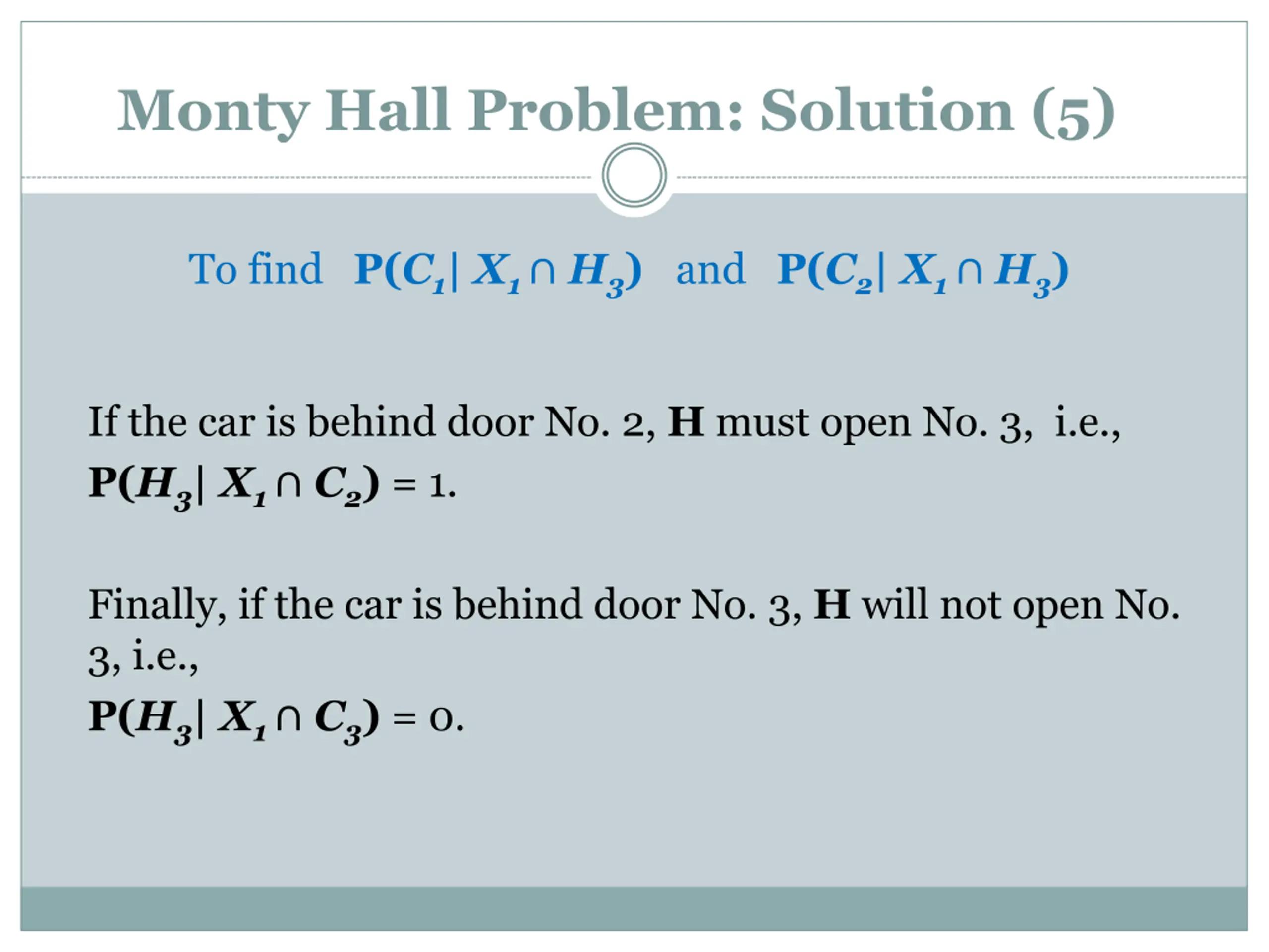 Monty Hall Problem: Solution (5) To find P(C1| X1 H3) and P(C2| X1 H3) If the car is behind door No. 2, H must open No. 3, i.e., P(H3| X1 C2) = 1. Finally, if the car is behind door No. 3, H will not open No. 3, i.e., P(H3| X1 C3) = 0.