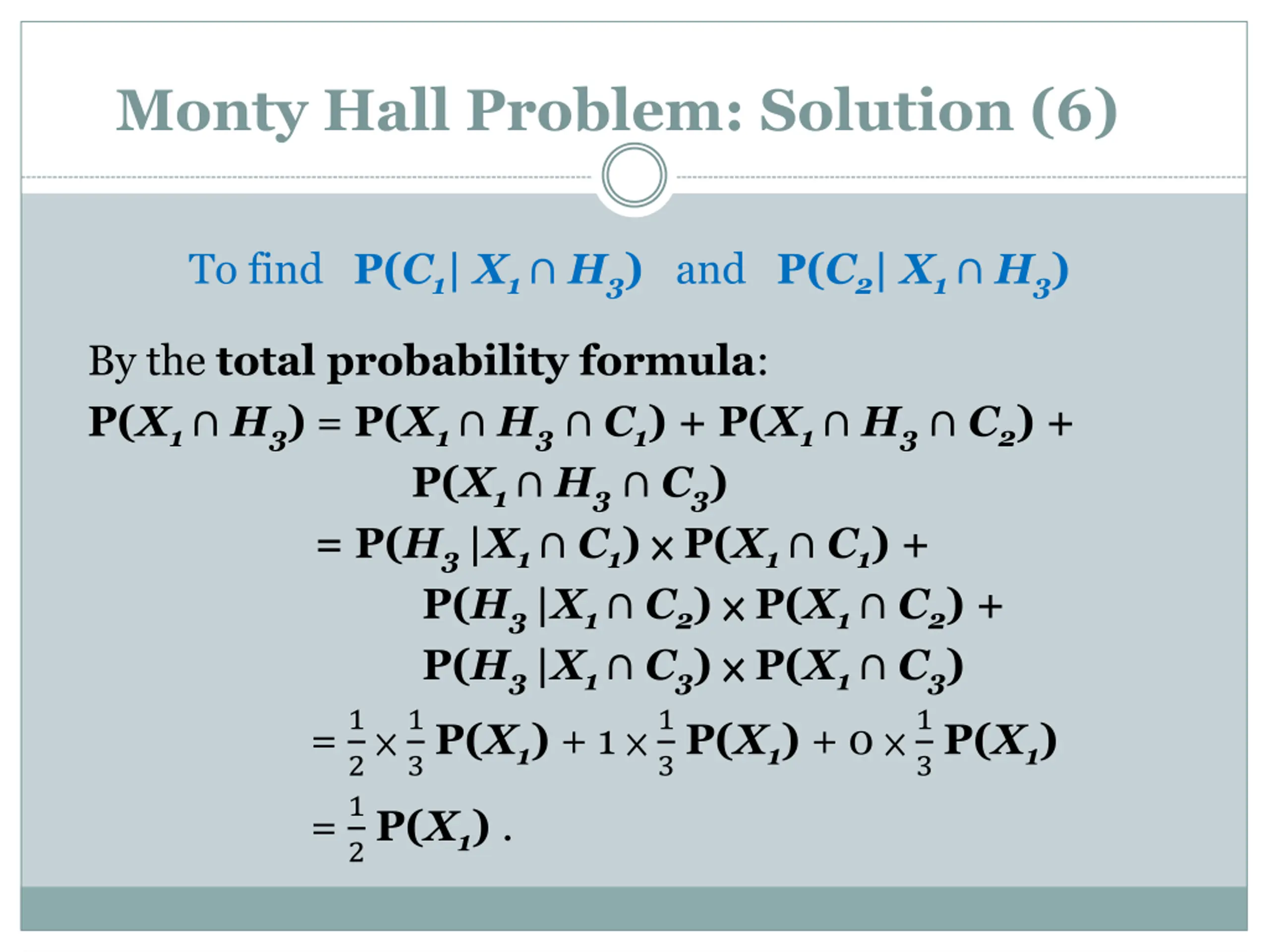 Monty Hall Problem: Solution (6) To find P(C1| X1 H3) and P(C2| X1 H3) By the total probability formula: P(X1 H3) = P(X1 H3 C1) + P(X1 H3 C2) + P(X1 H3 C3) = P(H3 |X1 C1) P(X1 C1) + P(H3 |X1 C2) P(X1 C2) + P(H3 |X1 C3) P(X1 C3) = 1 2 1 = 1 3P(X1) + 1 1 3P(X1) + 0 1 3P(X1) 2P(X1) .