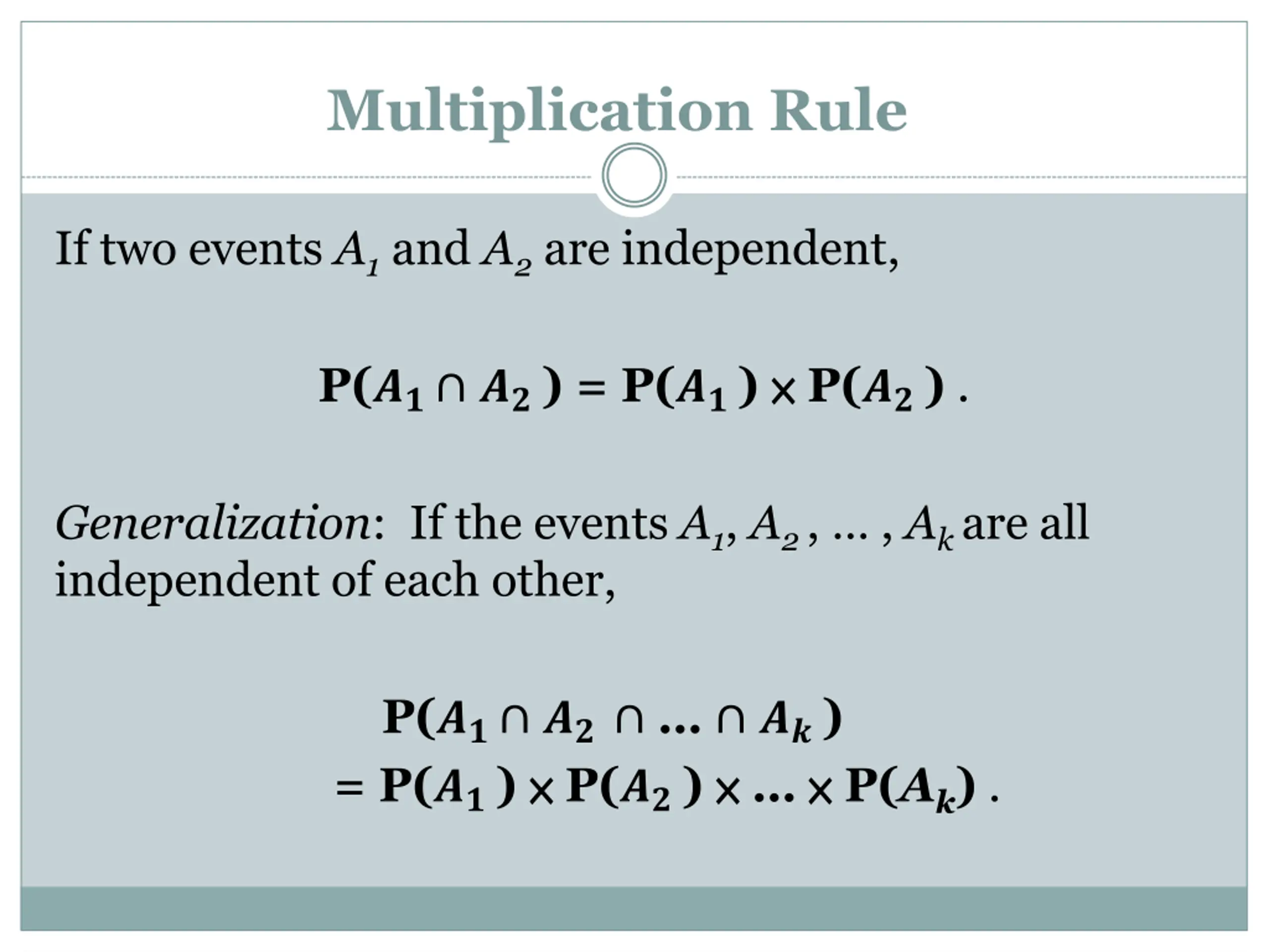 Multiplication Rule If two events A1and A2are independent, P(?? ??) = P(??) P(??) . Generalization: If the events A1, A2 , , Akare all independent of each other, P(?? ?? ??) = P(??) P(??) P(Ak) .