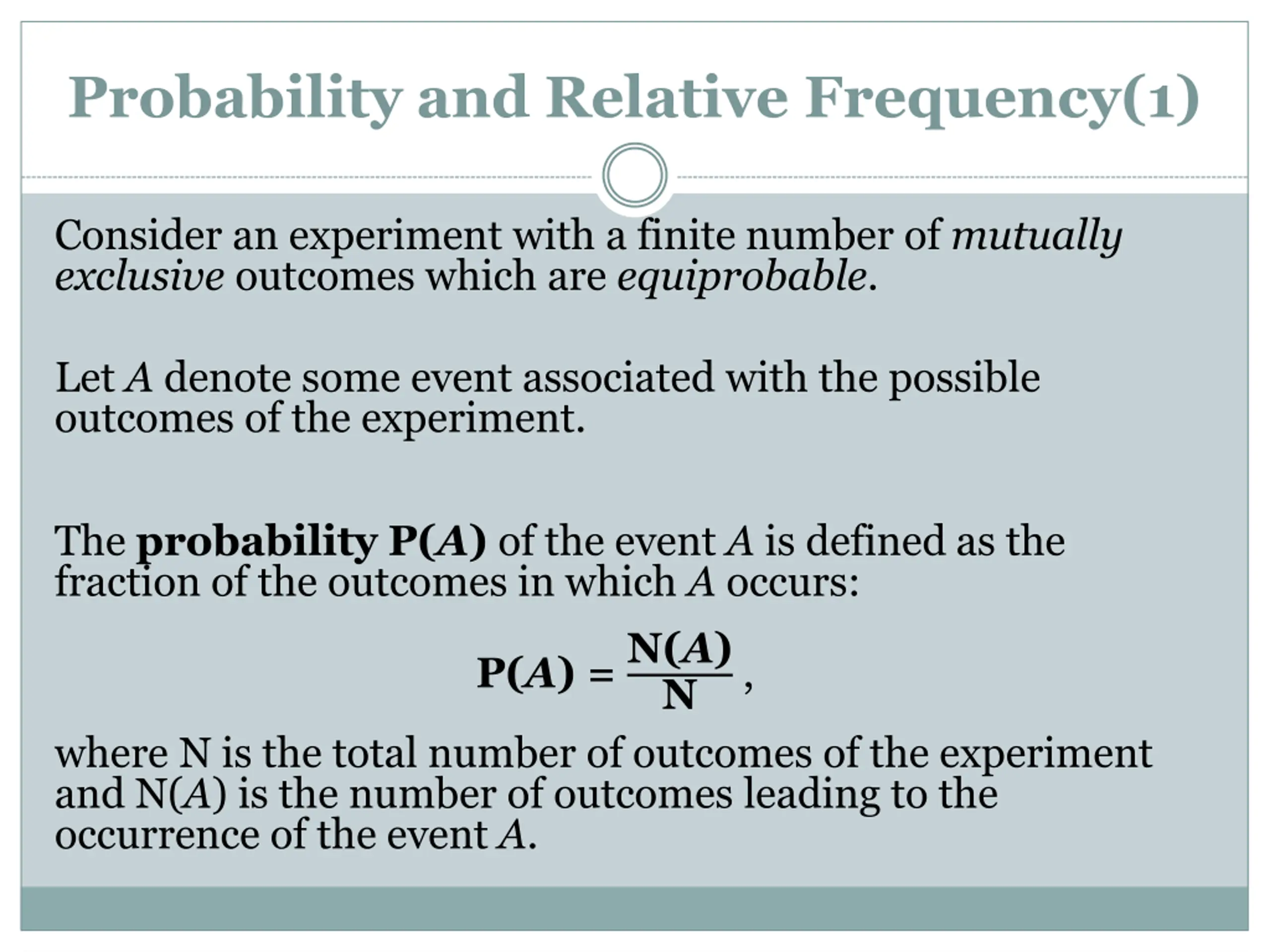 Probability and Relative Frequency(1) Consider an experiment with a finite number of mutually exclusive outcomes which are equiprobable. Let A denote some event associated with the possible outcomes of the experiment. The probability P(A) of the event A is defined as the fraction of the outcomes in which A occurs: P(A) = N(A) , N where N is the total number of outcomes of the experiment and N(A) is the number of outcomes leading to the occurrence of the event A.