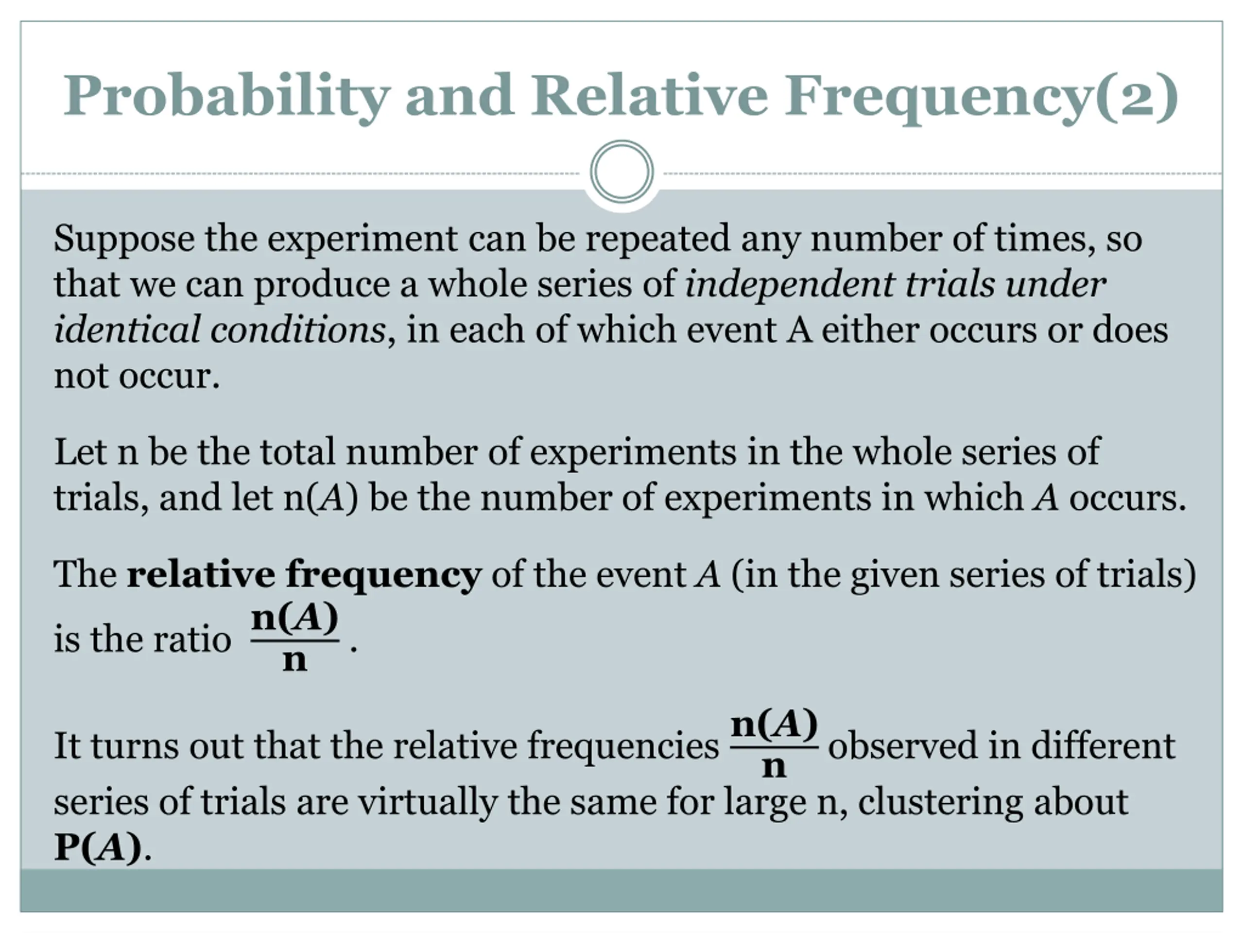 Probability and Relative Frequency(2) Suppose the experiment can be repeated any number of times, so that we can produce a whole series of independent trials under identical conditions, in each of which event A either occurs or does not occur. Let n be the total number of experiments in the whole series of trials, and let n(A) be the number of experiments in which A occurs. The relative frequency of the event A (in the given series of trials) is the ratio n(A) n . It turns out that the relative frequencies n(A) series of trials are virtually the same for large n, clustering about P(A). observed in different n