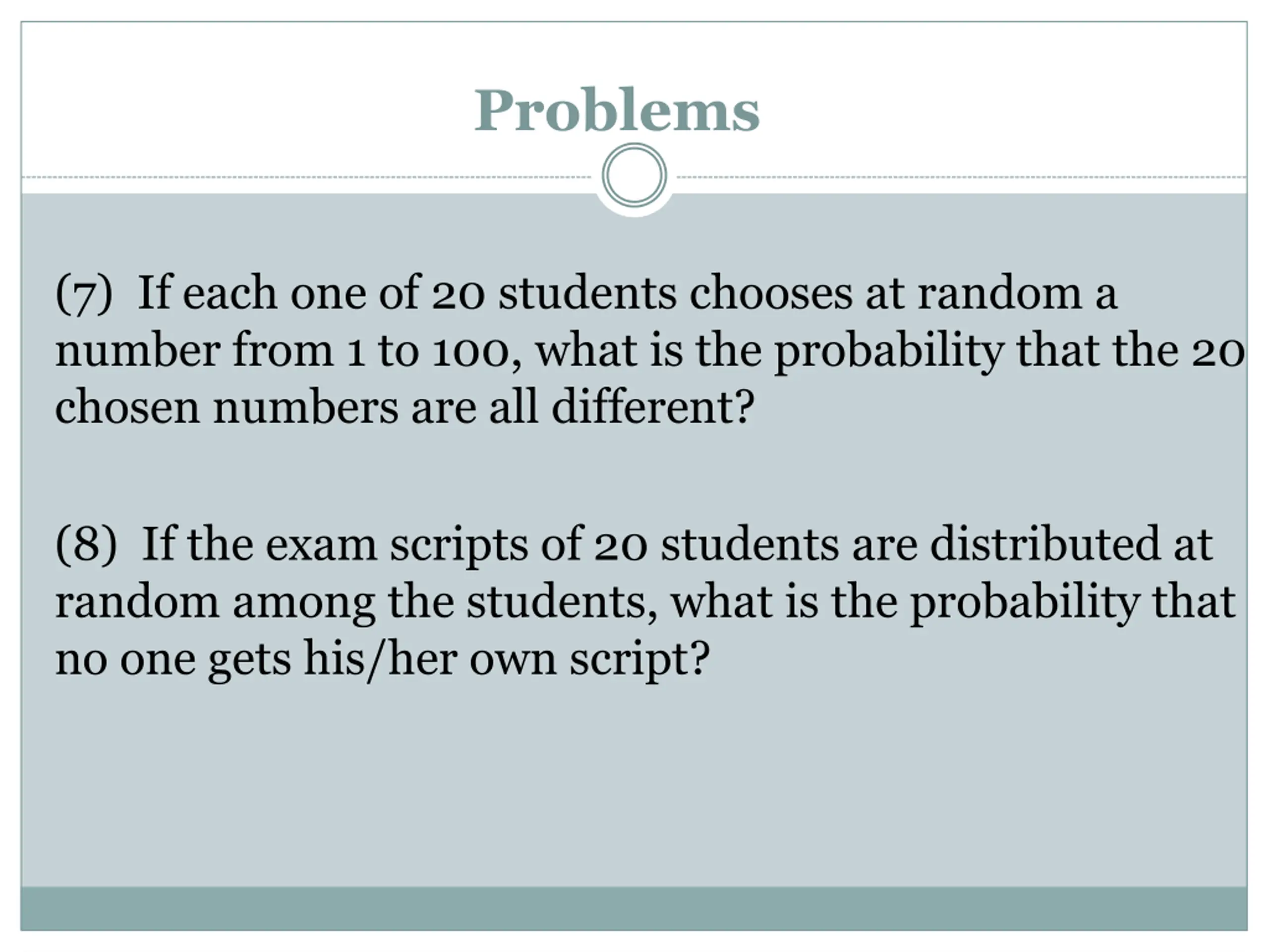 Problems (7) If each one of 20 students chooses at random a number from 1 to 100, what is the probability that the 20 chosen numbers are all different? (8) If the exam scripts of 20 students are distributed at random among the students, what is the probability that no one gets his/her own script?