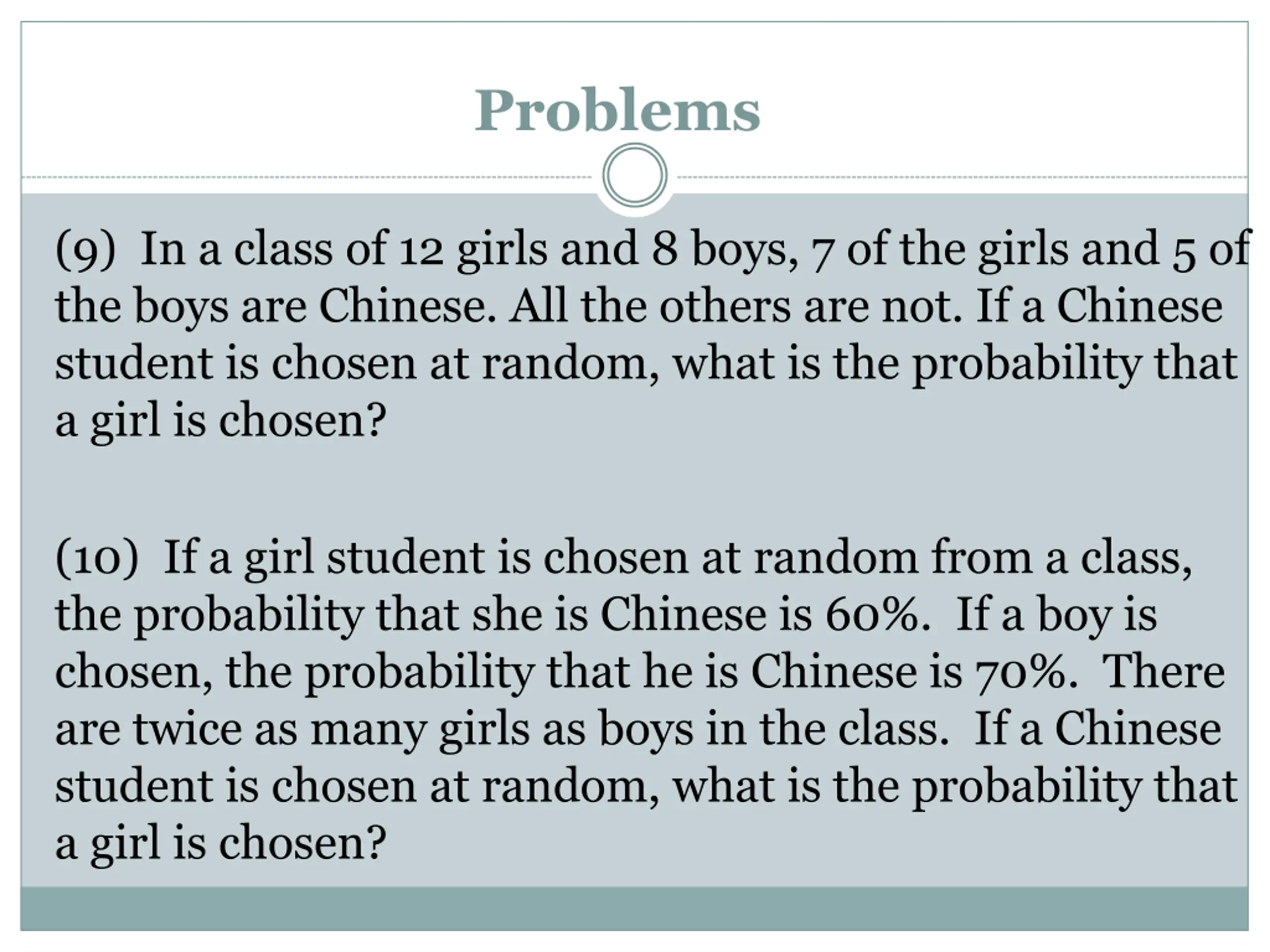 Problems (9) In a class of 12 girls and 8 boys, 7 of the girls and 5 of the boys are Chinese. All the others are not. If a Chinese student is chosen at random, what is the probability that a girl is chosen? (10) If a girl student is chosen at random from a class, the probability that she is Chinese is 60%. If a boy is chosen, the probability that he is Chinese is 70%. There are twice as many girls as boys in the class. If a Chinese student is chosen at random, what is the probability that a girl is chosen?