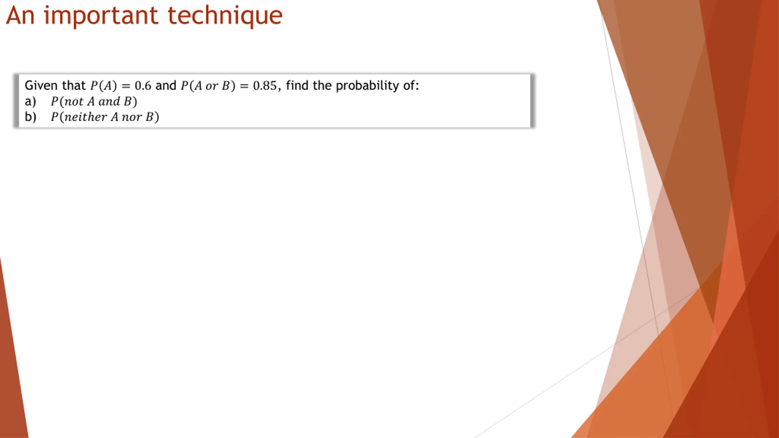 An important technique Given that ? ? = 0.6 and ? ? ?? ? = 0.85, find the probability of: a) ?(??? ? ??? ?) b) ? ???? ?? ? ??? ?