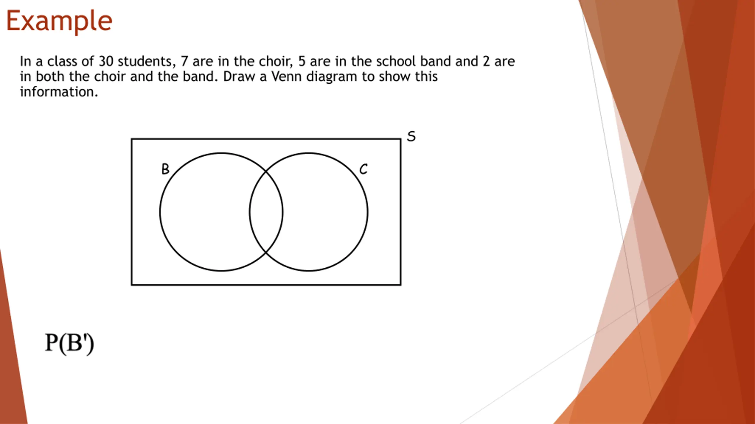 Example In a class of 30 students, 7 are in the choir, 5 are in the school band and 2 are in both the choir and the band. Draw a Venn diagram to show this information. S B C