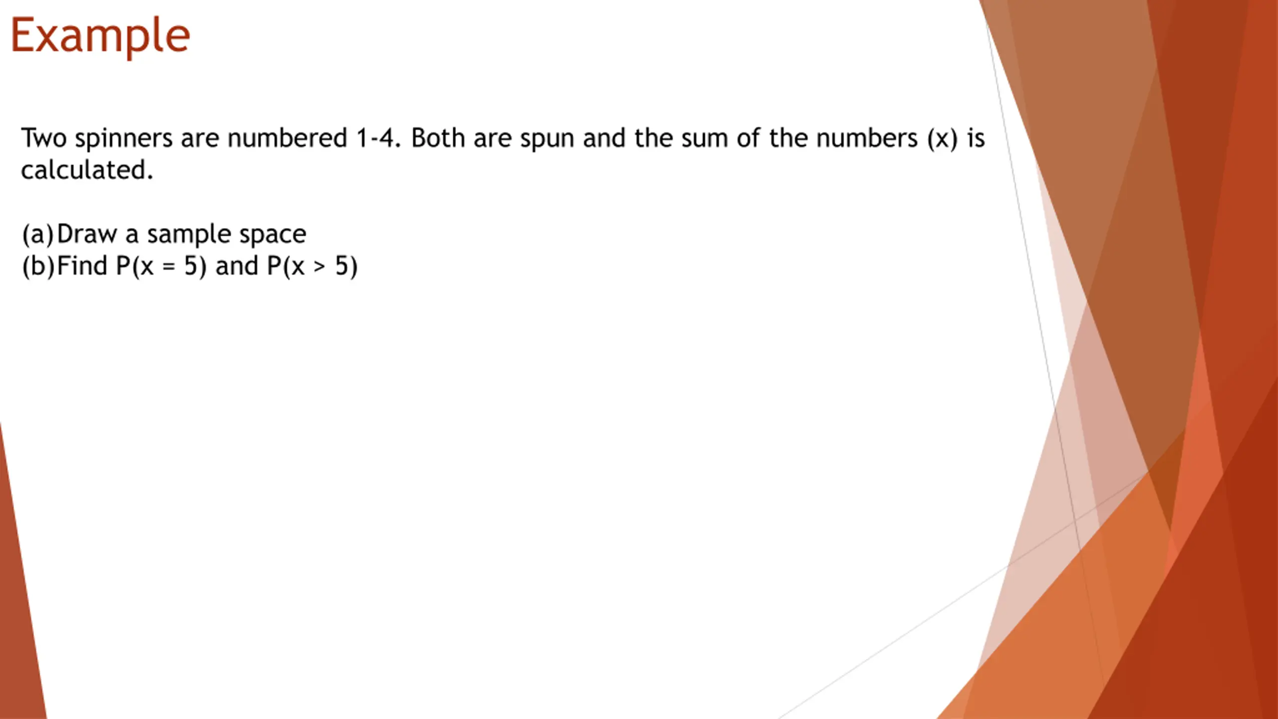 Example Two spinners are numbered 1-4. Both are spun and the sum of the numbers (x) is calculated. (a)Draw a sample space (b)Find P(x = 5) and P(x > 5)
