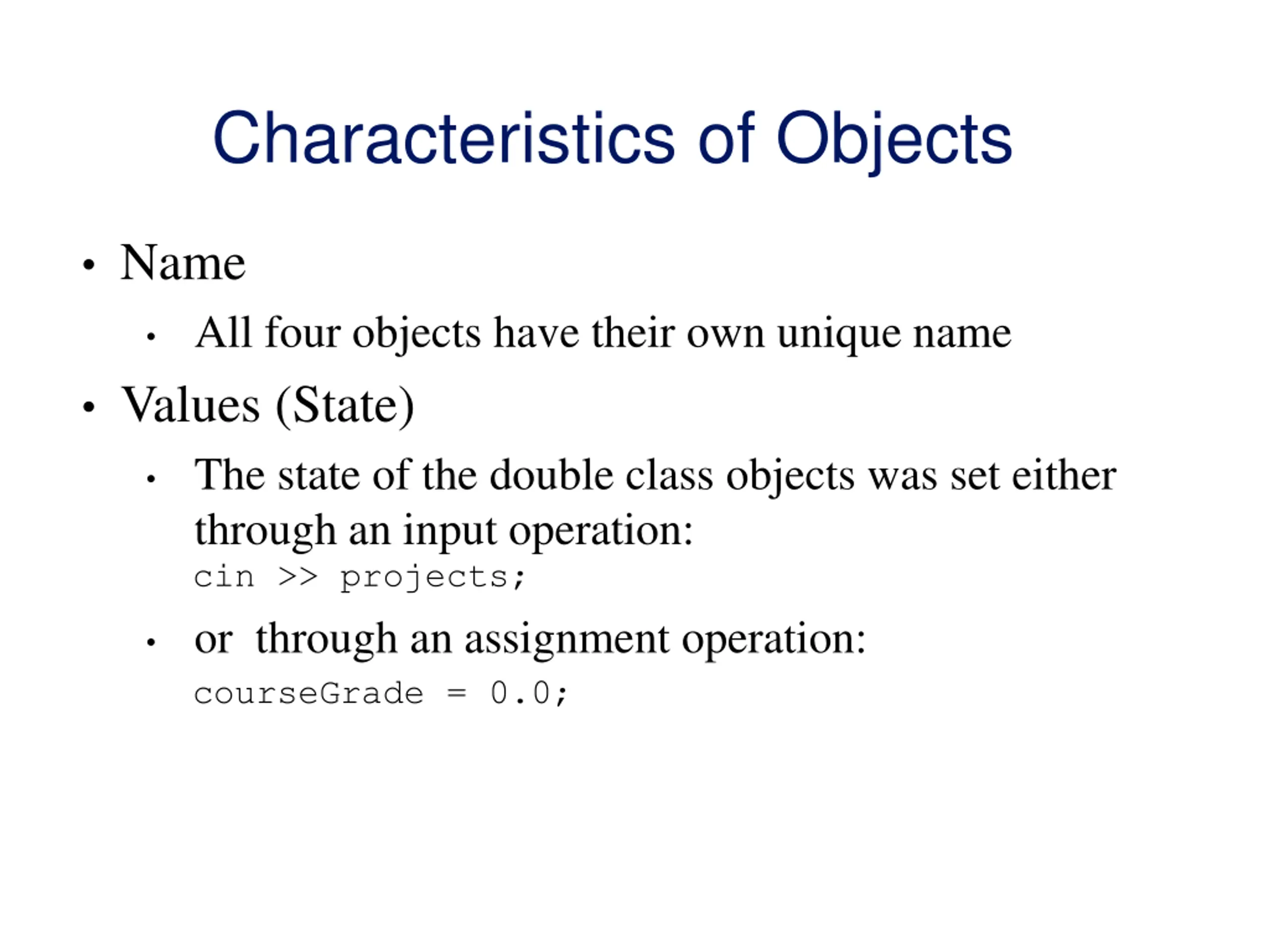 Characteristics of Objects Name All four objects have their own unique name Values (State) The state of the double class objects was set either through an input operation: cin >> projects; or through an assignment operation: courseGrade = 0.0;