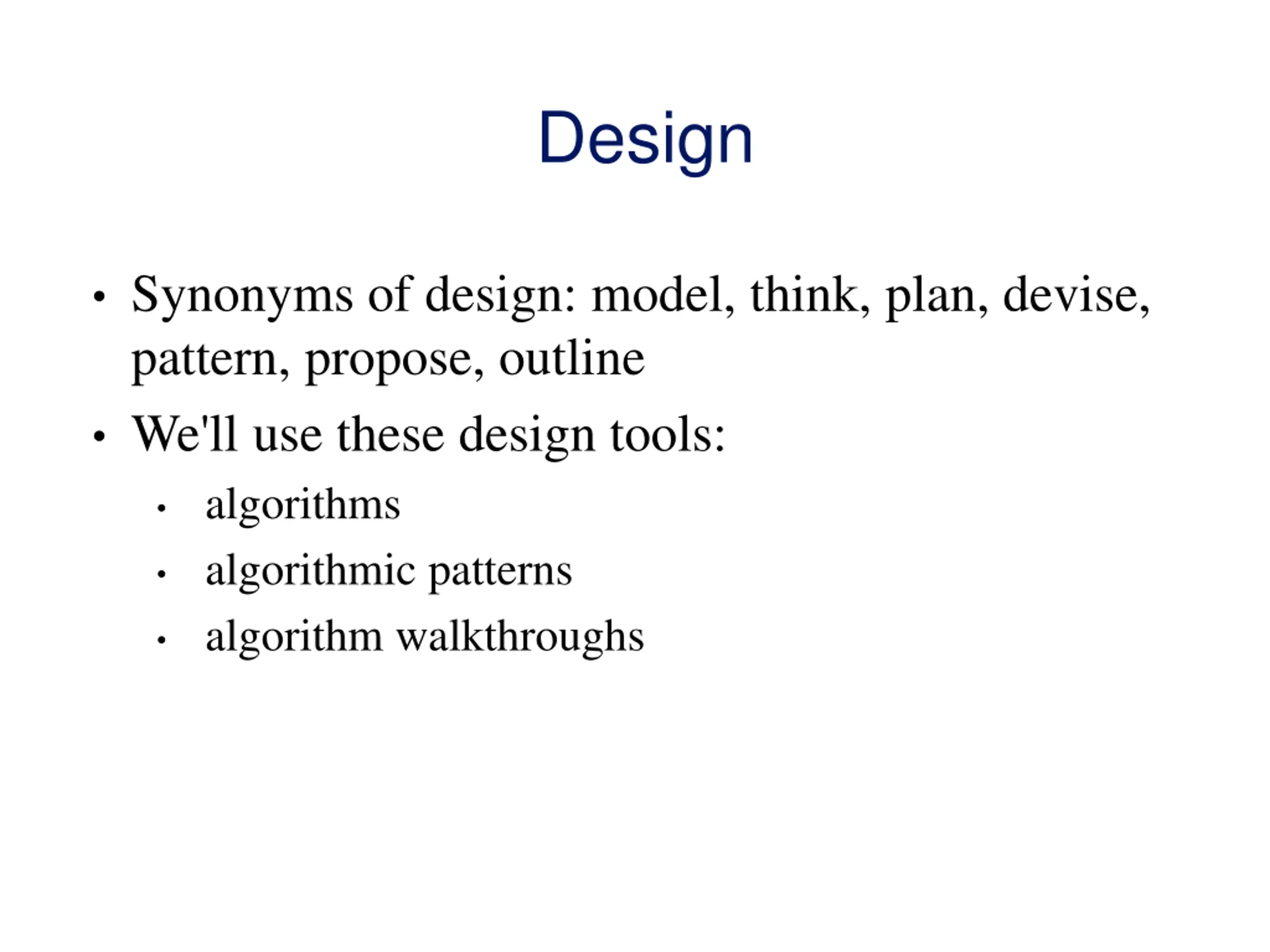 Design Synonyms of design: model, think, plan, devise, pattern, propose, outline We'll use these design tools: algorithms algorithmic patterns algorithm walkthroughs