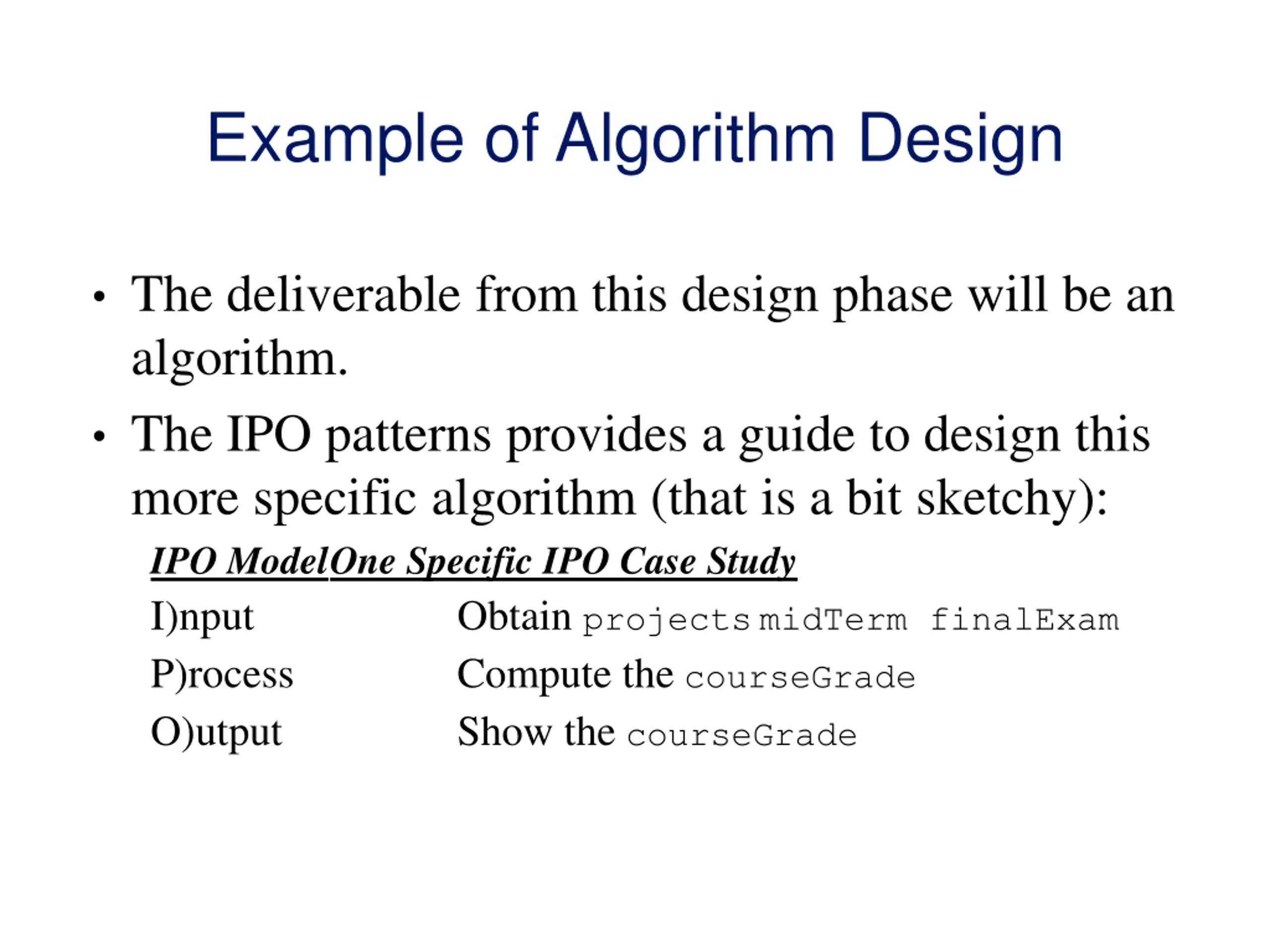 Example of Algorithm Design The deliverable from this design phase will be an algorithm. The IPO patterns provides a guide to design this more specific algorithm (that is a bit sketchy): IPO ModelOne Specific IPO Case Study I)nput Obtain projectsmidTerm finalExam P)rocess Compute thecourseGrade O)utput Show thecourseGrade