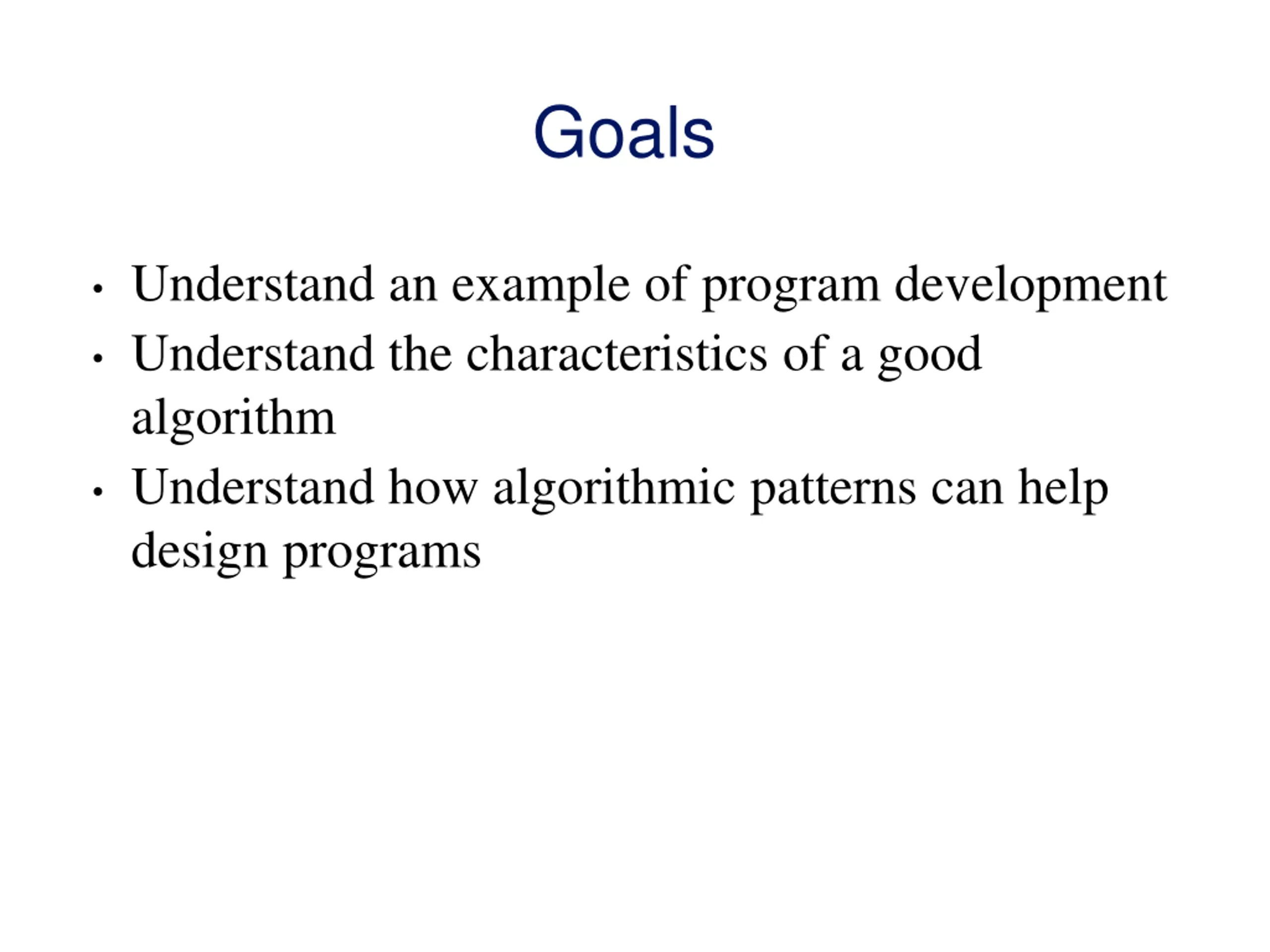 Goals Understand an example of program development Understand the characteristics of a good algorithm Understand how algorithmic patterns can help design programs