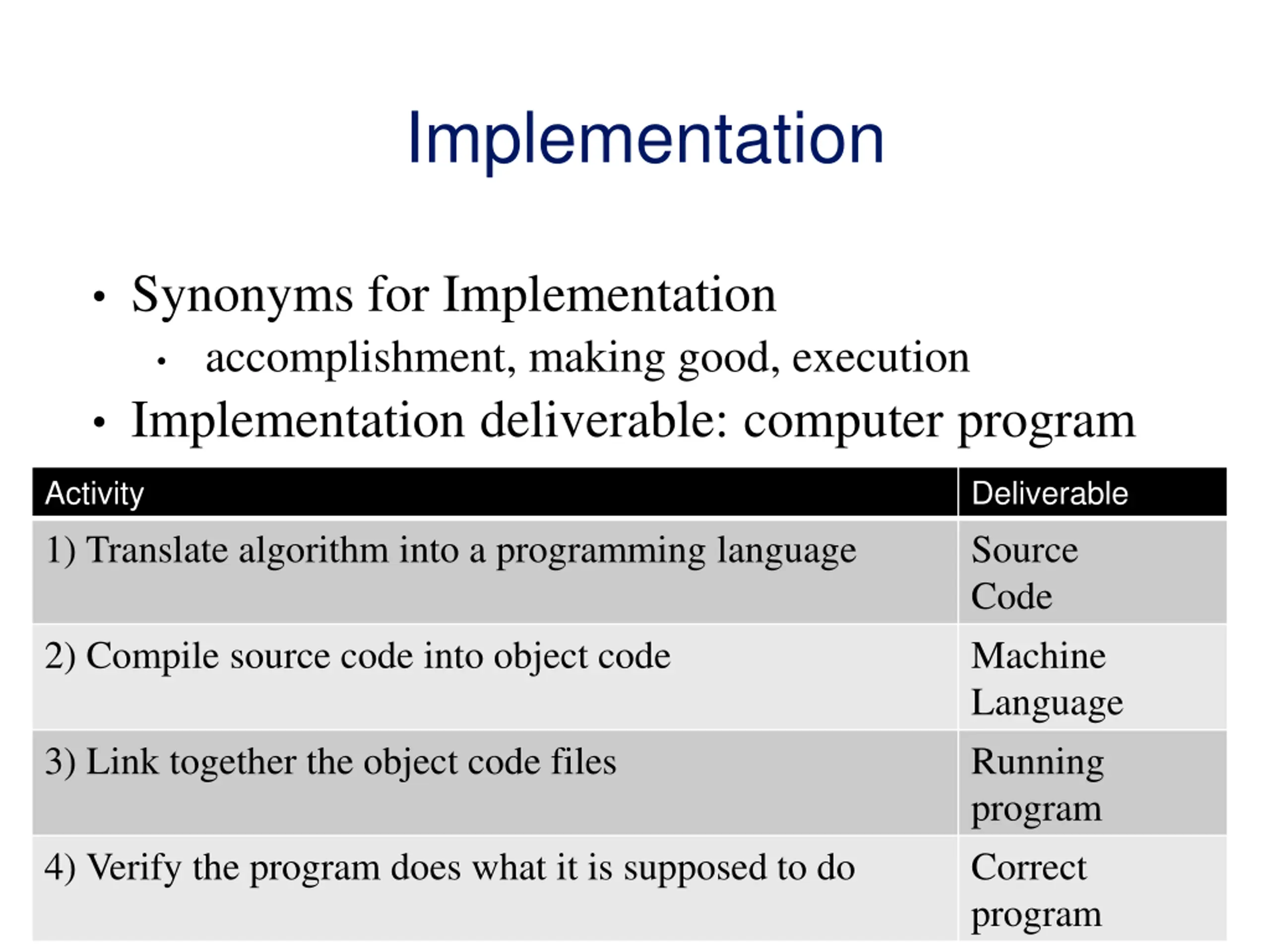 Implementation Synonyms for Implementation accomplishment, making good, execution Implementation deliverable: computer program Activity 1) Translate algorithm into a programming language Deliverable Source Code Machine Language Running program Correct program 2) Compile source code into object code 3) Link together the object code files 4) Verify the program does what it is supposed to do