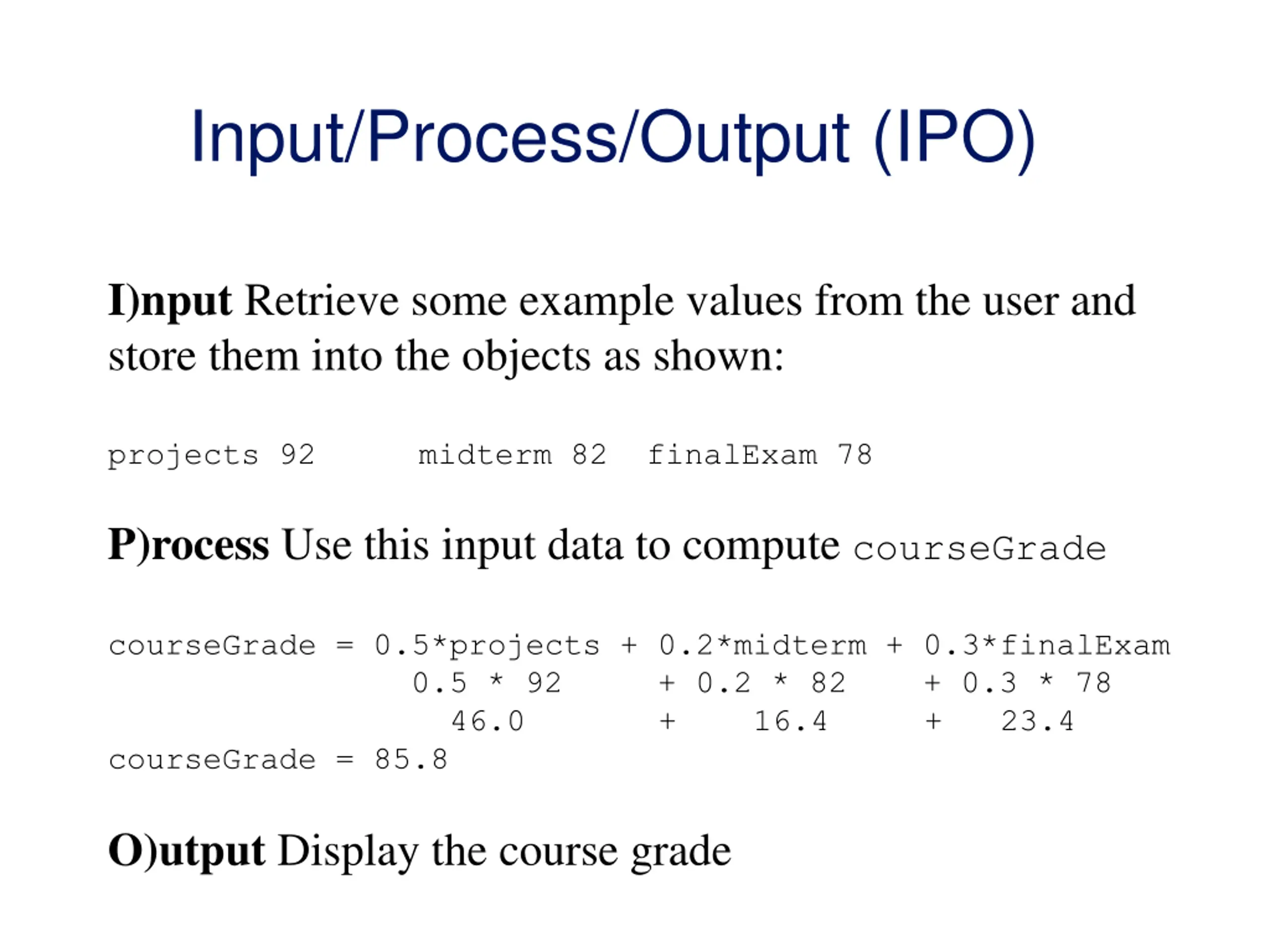 Input/Process/Output (IPO) I)nput Retrieve some example values from the user and store them into the objects as shown: projects 92 midterm 82 finalExam 78 P)rocess Use this input data to compute courseGrade courseGrade = 0.5*projects + 0.2*midterm + 0.3*finalExam 0.5 * 92 + 0.2 * 82 + 0.3 * 78 46.0 + 16.4 + 23.4 courseGrade = 85.8 O)utput Display the course grade
